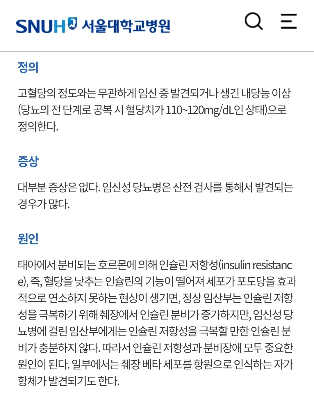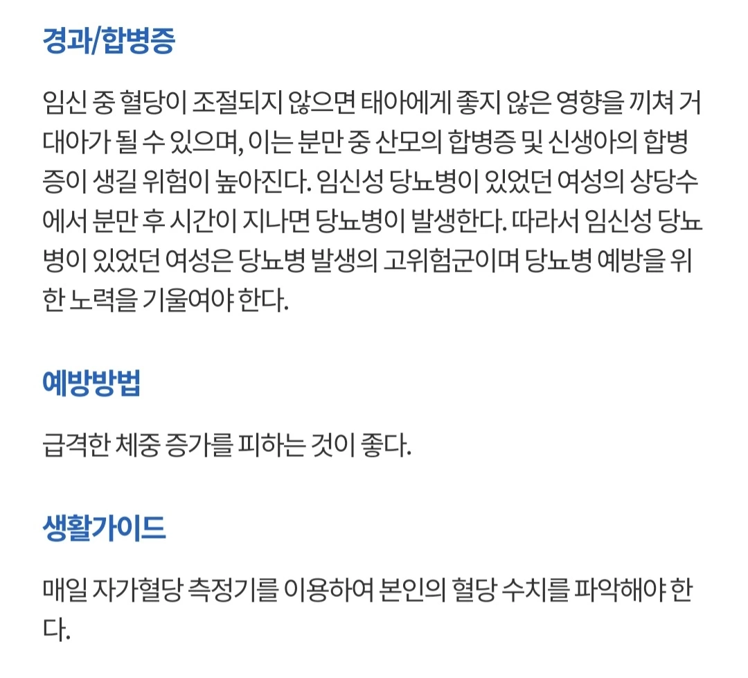 임신성 당뇨를 진단받으면 떡볶이나 파스타, 튀김, 빵 등 맛있는 탄수화물은 철저히 제한적으로 섭취해야 한다. 과일도 하루에 포도 8알이나 사과 1/3쪽, 바나나 1/2 개를 선택해서 한 번만 먹을 수 있다. 매 끼니에 단백질 100그램 정도는 반드시 챙겨 먹어야 했고 밥은 흰쌀밥 대신 현미로, 빵은 거친 통곡물 빵을 밥대신 1쪽 정도만 먹을 수 있다. 2~3개의 나물 반찬이나 샐러드를 꼭 함께 먹어야 했다. 고구마나 옥수수 등 혈당이 올라가는 간식은 작은 걸로 1/2개 정도만 허용됐고 우유나 두유도 둘 중에 하나만 선택해서 하루 한 개만 먹을 수 있었다. 공복 혈당과 매 끼니 후에 세 번의 식후 혈당까지 하루 네 번은 손가락을 찔러서 혈당을 확인해야 했다. 식 후 세 번씩 가벼운 산책으로 혈당이 올라가지 않도록 막아야 했다. 물론 혈당 조절이 안 되는 산모는 약을 복용할 수도 있다. 하지만 나는 다행스럽게 식이조절과 운동으로 혈당관리가 가능했다.