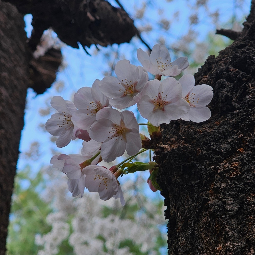 보통의 꽃들이 가지 끝으로 에너지를 보내 세상을 향해 손짓할 때, 이 꽃들은 나무의 가장 깊은 중심, 즉 심장과 가장 가까운 곳에서 피어났습니다. 차마 멀리 보내지 못하고 제 몸속에 꼭 껴안고 있다가, 견딜 수 없는 생명의 환희를 이기지 못해 툭, 하고 터뜨린 진실한 고백 같습니다.