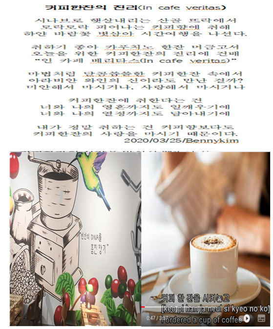 내 커피한잔 속엔 행복도 있고, 우정도 있고, 사랑도 있나니, 마법처럼 달콤씁쓸한 커피한잔 속에서 아라비안 와인의 신이라도 만난 걸까? 마냥‘호모 커피엔스’처럼 살아가고 싶을 뿐이다. 취하기 좋아 카푸치노 한잔 머금고서 오늘을 위한 커피한잔의 진리에 건배 “인 카페 베리타스! (In cafe veritas: 커피속에 진실이 있나니)”