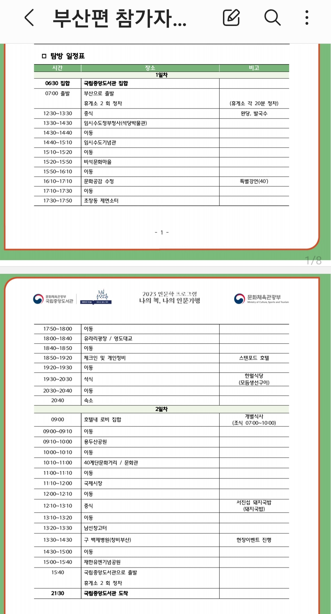 보내주신 세부 일정 일정 내내 비가 많이 왔다. 그럼에도 모든 일정을 소화할 수 있었던 것은 운영진의 노고와 참가자들의 긍정적인 마음 덕분이었다. 푹푹 젖어들어가는 운동화를 신고도 즐거웠다.