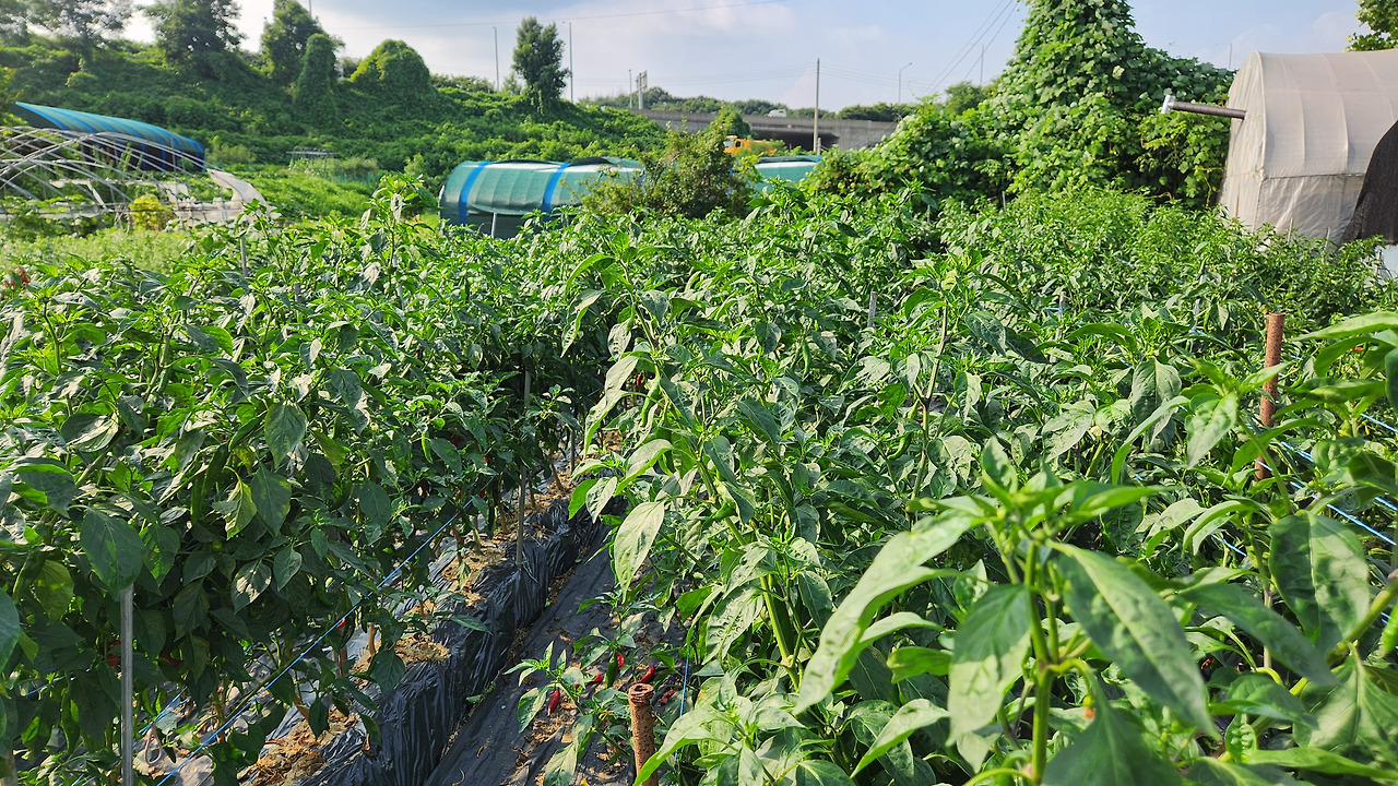 무성한 고춧잎과 휘어진 오이덩굴에 자식이 온다는 기대와,