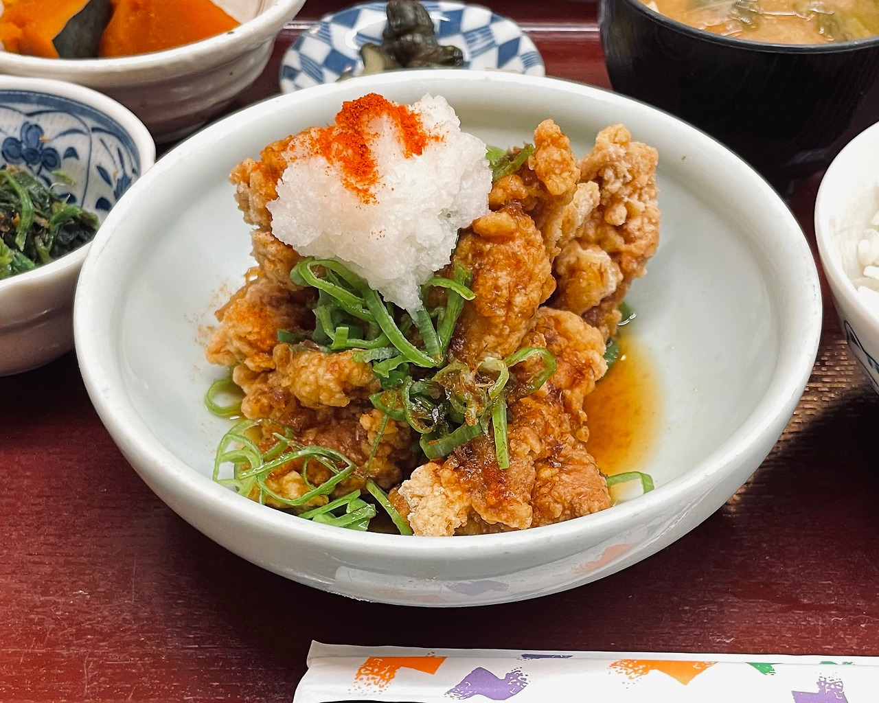 원래는 체크인 후 미리 봐두었던 식당에 가려고 했지만, 너무나 배가 고파진 우리는 그냥 둘러보다 근처에 있는 현지인 맛집처럼 보이는 곳으로 들어갔다. 그랬더니 아주 나이가 지긋한 노부부가 나와서는 우리를 반겼다. 그 웃음에 우리는 “こんにちは!”(콘니치와)를 외치며 자리에 앉았다. 메뉴는 칠판(?)이라고 해야 할지, 큰 널빤지에 수기로 적혀져 있었는데, 도무지 알아보기 힘든 글씨체에 우리가 칠판만 뚫어지게 쳐다보고 있자, 주인 할아버지께서는 가게의 대표 메뉴를 추천해 주셨다. 그래서 우린 ‘그래, 바로 그거다!‘ 라며 세 명 모두 할아버지의 추천 메뉴를 시켰다. 그 메뉴는 바로 폰즈 소스가 위에 뿌려져 있는 가라야게정식이었는데, 호기롭게 시켰던 아까와는 달리 우리는 한 입 먹자마자 서로 동공지진이 일어났다. 생각보다 매우 새콤한 소스에 가라야게 맛을 전혀 느낄 수 없었던 우리는 당황을 했다. 폰즈 소스는 그동안 이름만 들어봤지 이렇게나 새콤한 녀석이었을지는 꿈에도 몰랐던 우리는 어쩌면 꾸역 꾸역이라는 표현대로 정식을 먹고 있었다. 그런데, 갑자기 문을 열리더니 줄줄이 화이트 칼라의 회사원들이 들어오기 시작했다. 알고 보니 여기가 남자 회사원/아저씨들의 찐 현지 맛집이었던 것이다.