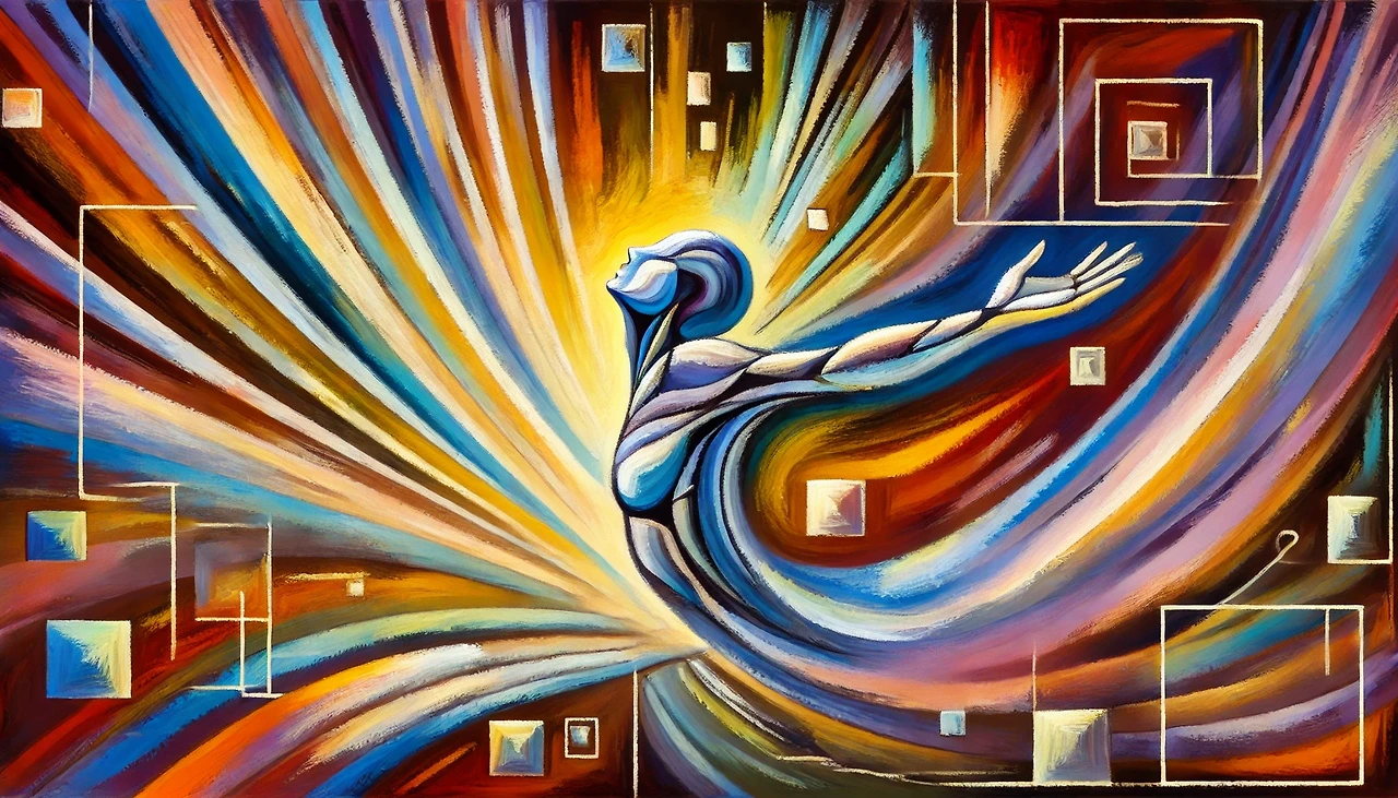 열린 팔과 흐르는 선들은 감정의 해방을, 겹겹이 쌓인 배경은 삶의 층위 속에서 발견된 자유를 상징합니다.