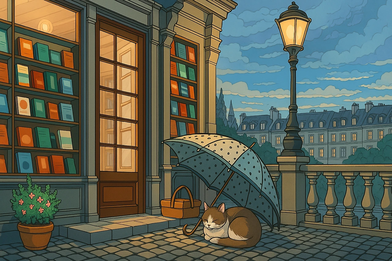 문을 반쯤 열어둔 서점 앞, 작은 우산 아래 고양이가 웅크리고 있다.