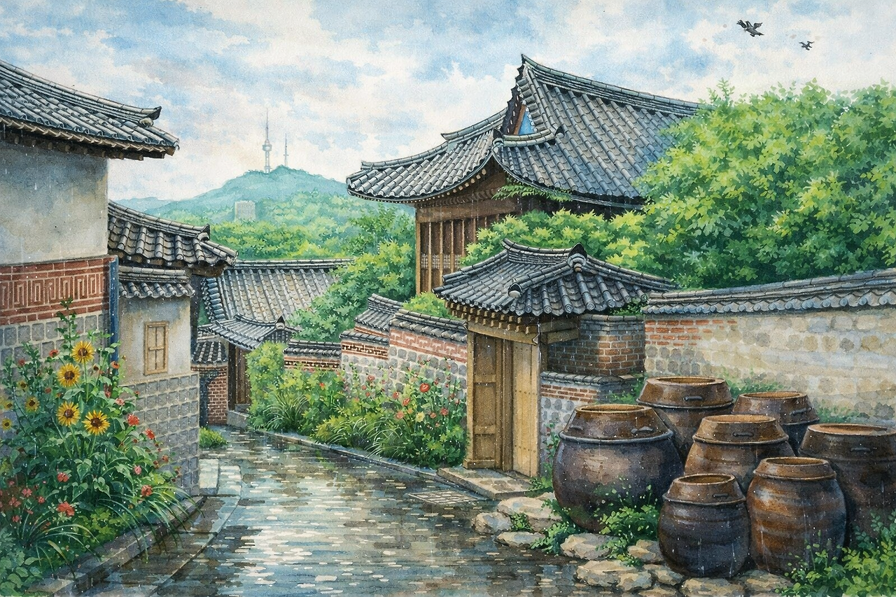한옥의 기와지붕 끝에 매달린 물방울이 천천히 떨어지는 소리를 들으며, 나는 골목 안으로 걸어 들어갔다.