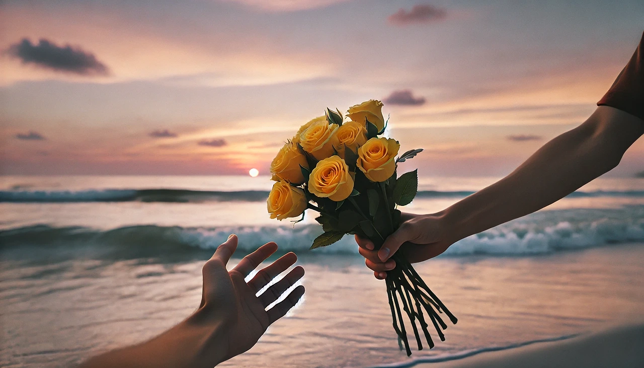 In this golden light, a hand reaches out—offering a bouquet of yellow roses.