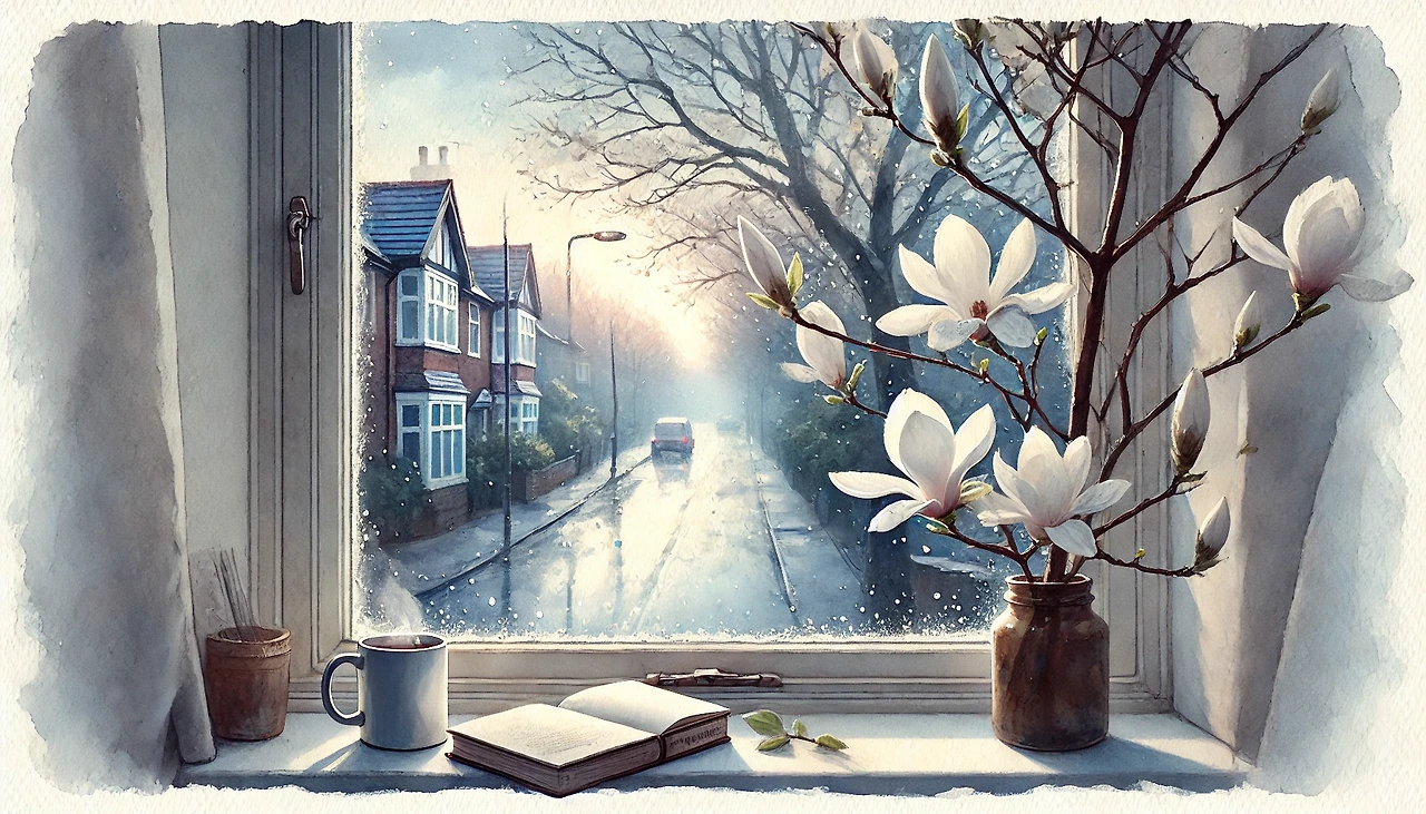 흐린 하늘 아래 피어난 하얀 목련, 그리고 창가에 놓인 따뜻한 차와 일기장이