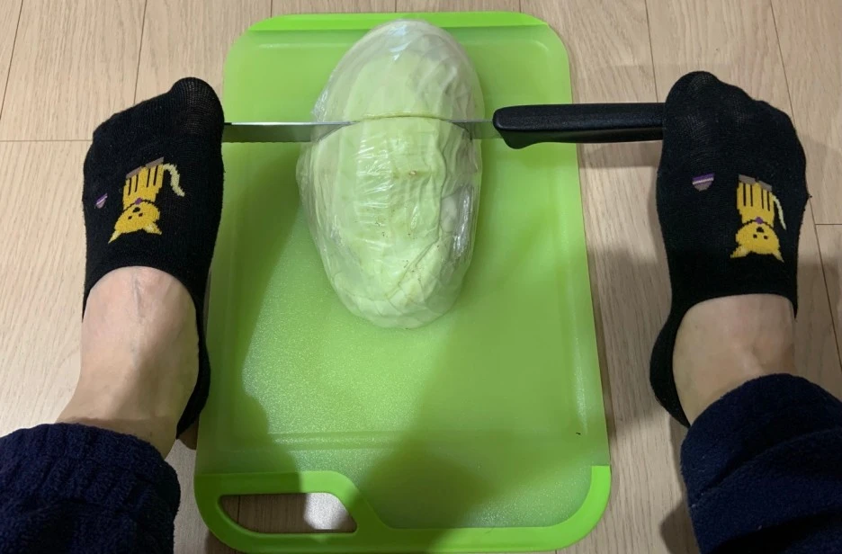 도마를 바닥에 내려놓고 집에서 제일 긴 스테인리스 빵 칼로 양배추 가운데를 쿡 찔러 고정했다. 두 발을 칼 양쪽 끝에 올린 후, 한 다리씩 번갈아 가며 힘을 주니 칼날이 서서히 배추 속으로 들어간다. 쉬워 쉬워. 양배추가 금방 두 동강이 났다.(팔을 아끼라는 말에 발기술이 늘어났습니다.)