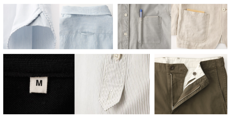 무인양품 매장엔 이 계절에 어울리는 옷은 있지만, 이 계절에 반드시 입어야 하는 옷은 없다. 당연하게도 특정 연령대나 라이프스타일을 고려하지도 않는다. 일상에서 누구나 편하게 입을 수 있는 옷을 만드는 것이 무인양품의 생각과 맞아떨어지기 때문이다. 상품은 '무지 라보 Muji Labo', '레귤러 Regular', '리무지 Re Muji'로 나뉜다. '무지 라보'는 옷에 새로운 소재를 적용하는 가장 실험적인 의류다. '레귤러'는 무인양품답다고 여길만한 의류이고, 매장에서 가장 먼저 눈에 들어오는 라인이라고 이해하면 쉽다. '무지 라보'가 실험주의라면, '리무지'는 일종의 순환 프로젝트이다. 소비자가 무인양품에서 구매한 옷을 무인양품에 기부하면, 무인양품은 옷 상태를 파악해서 재생 작업이 가능하다 판단하면 리무지 라벨을 단 새로운 옷이 되고, 재생이 불가능한 옷을 에탄올로 환원되어 에너지로 사용된다. 리무지는 현명한 소비에 대한 무인양품의 새로운 대안이다.
