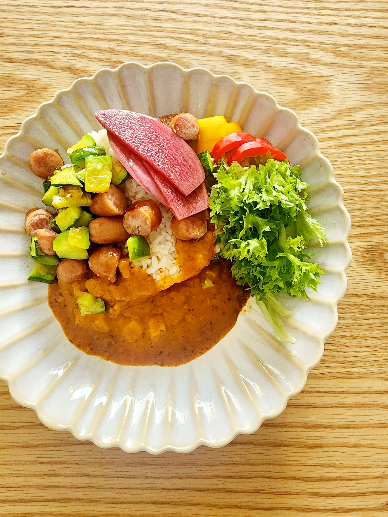 2. 그릇에 밥을 깔고 반만 카레를 붓고 나머지 반에는 볶아둔 야채와 소시지를 올리고 나는 만들어 둔
