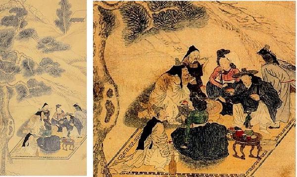 위의 그림은 조선후기의 풍속도로 우리에게도 너무나 유명한 단원 김홍도의 설하연적도(雪下煙炙圖)라는 작품입니다. 오른쪽은 왼쪽의 전체 그림이 희미하여 고기구워 먹는 모습만 확대한 부분그림입니다. 설하연적도란 말그대로 눈이 오는 아래에서 연기를 피우며 고기를 굽는 그림이란 뜻입니다. 적(炙)이란 고기를 굽는다는 뜻인데 글자모양 그대로 고기(月;肉을 이렇게 쓰지요)를 불(火)위에 올려놓은 모습입니다.