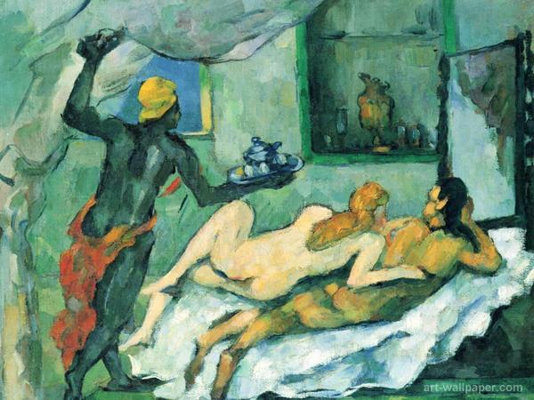 한쪽은 옷을 입고 한쪽은 안입고 이런게 불공평한 것 같으면 여기 둘 다...안 입은 작품이 있습니다. 폴 세잔느의 '나폴리에서 점심먹은 뒤'라는 작품인데 제목은 해설서마다 조금씩 다릅니다. 아무튼 두 남녀가 맛있게 점심을 먹고 침대에 누워 사이좋게 지내고 있는데 하인이 홍차인지 커피인지를 식후 디저트로 가져다 주는 그림입니다. 먹고, 사랑하고, 마시고...참 좋은 하루인 것 같습니다. 뭐, 제가 이런 걸 부러워해서 올린 그림은 아닙니다. 마네 그림만 올리자니 남녀 평등이 걸려서, 골라본 겁니다.