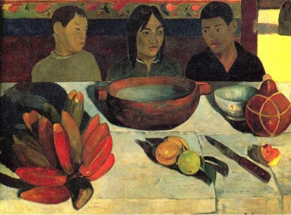아래 작품은 누구의 작품인지 눈에 금세 들어옵니다. 고호의 친한 친구이면서, 타히티에서 많은 작품을 그린 고갱의 그림입니다. 제목은 '식사: 바나나가 있는 정물' 입니다. 탄수화물이 많아 식사로 먹을 수 있는 바나나 같은 열대과일을 테이블위에 올려놓은 아이들의 모습입니다. 매일 이렇게 먹으라면 힘들겠지만, 가끔씩은 이렇게 식사를 해도 좋을 것 같습니다.