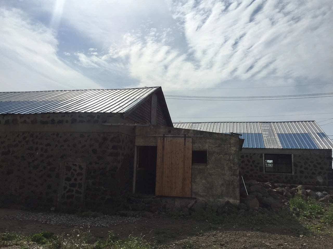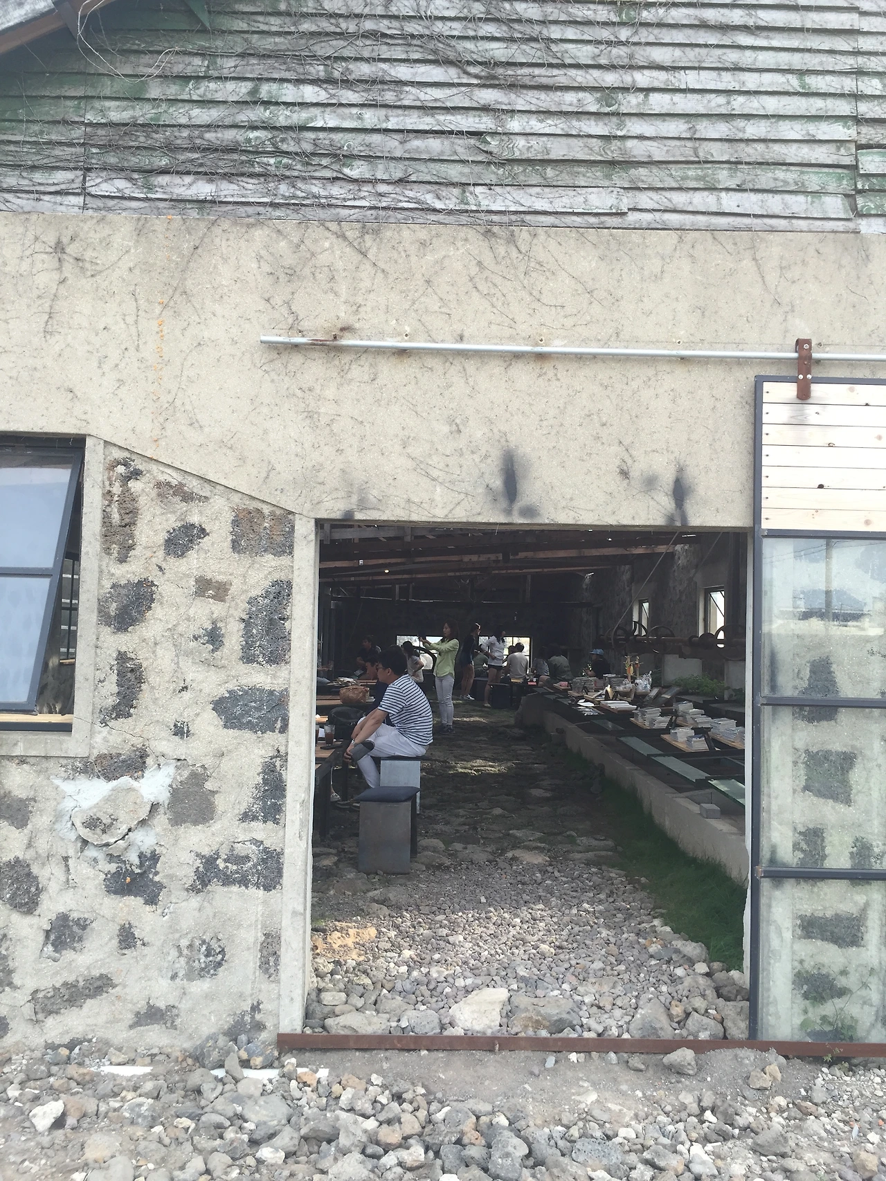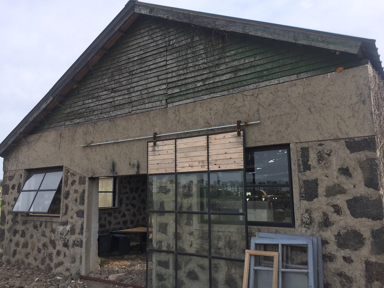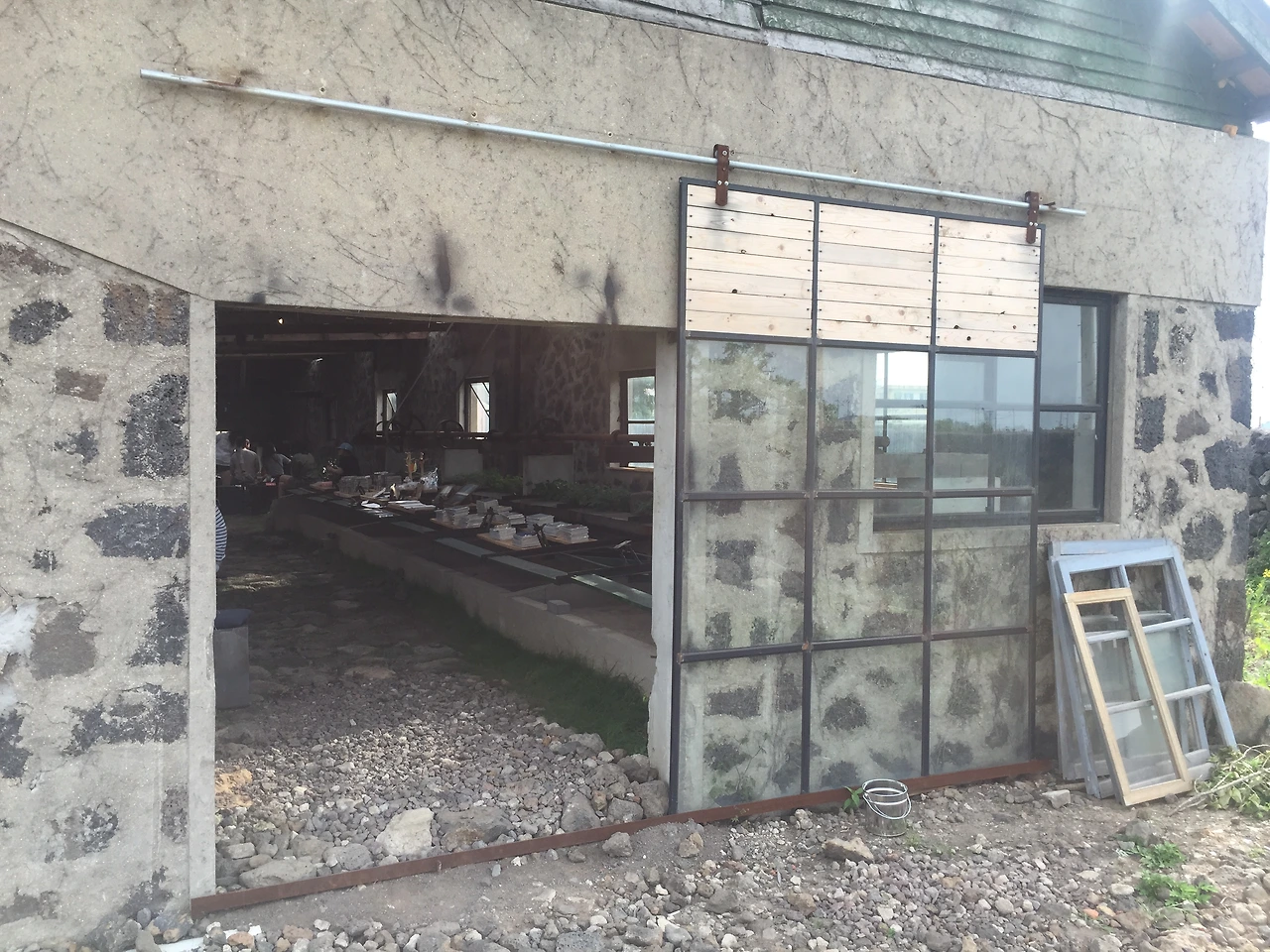 유리창 몇몇 보이고 벽은 옛날 돌담형태를 띠고 있다.
