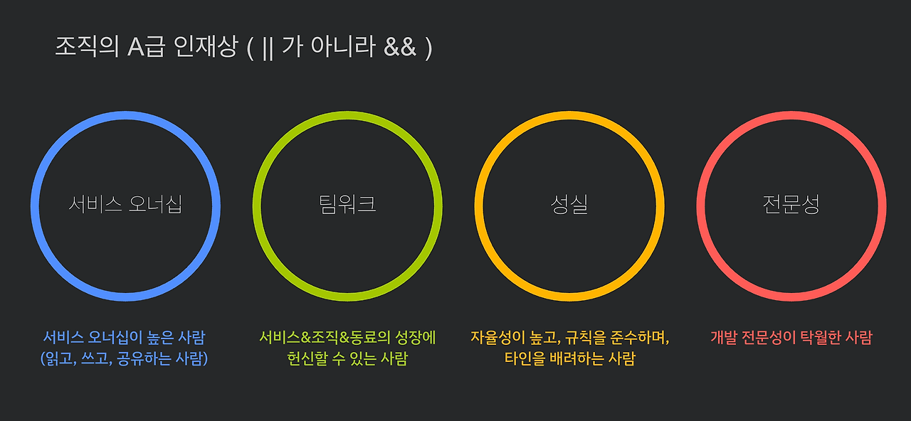 우리 조직의 A급 인재상은 서비스 오너십, 팀워크, 성실, 전문성을 두루 갖춘 개발자다.