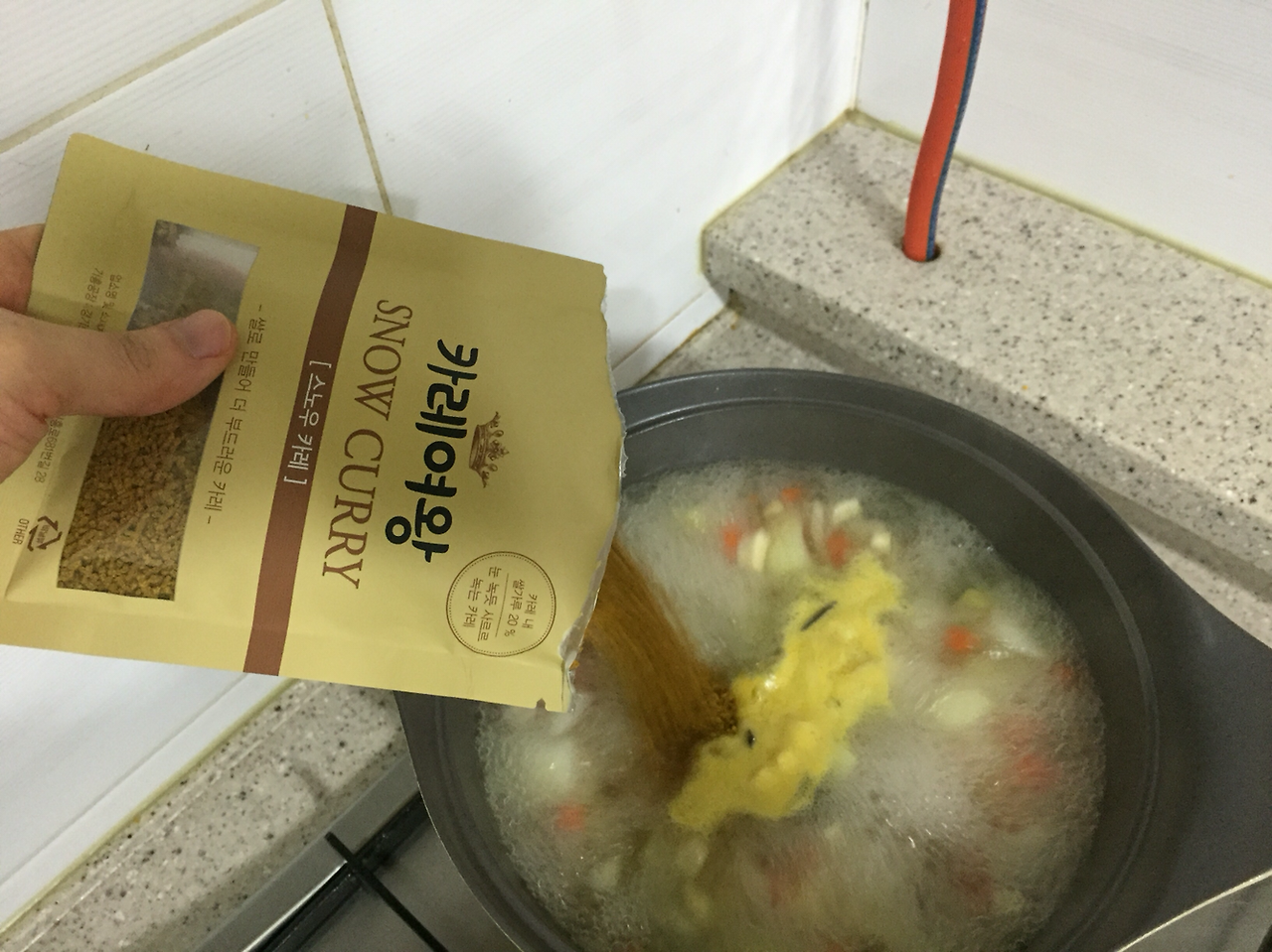 분말 수프? 소스? 를 넣을 때 조금만 뜯는 거보다는 한 번에 끝까지 뜯어서 부어야지 막힘 없이 한 번에 쏟아 부을 수 있다.