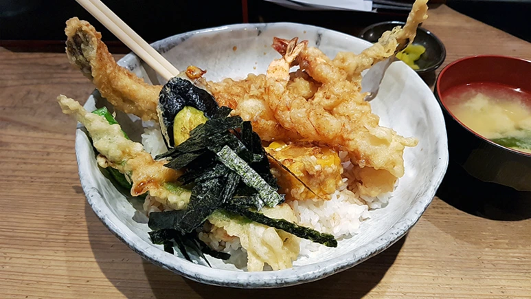 ※일본 덮밥 요리를 '돈부리'라하며 돈부리는 도자기 사발을 뜻한다.(그래서 텐동이 도자기 그릇에 나왔군!) 돈부리를 간단히 '동(丼)이라 하는데, 밥에 튀김을 얹으면 텐동, 돈카츠를 얹으면 카츠동, 장어를 얹으면 우니동, 쇠고기 조림을 얹으면 규동이 된다.