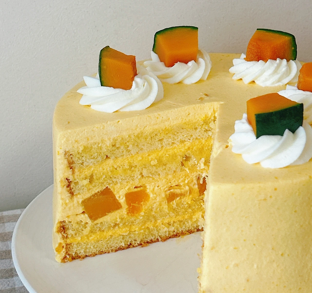 촉촉한 단호박 시트, 달큰한 단호박 크림, 부드러운 식감의 단호박 조각이 한데 어우러져 정말이지 맛있는 케이크가 만들어졌다.