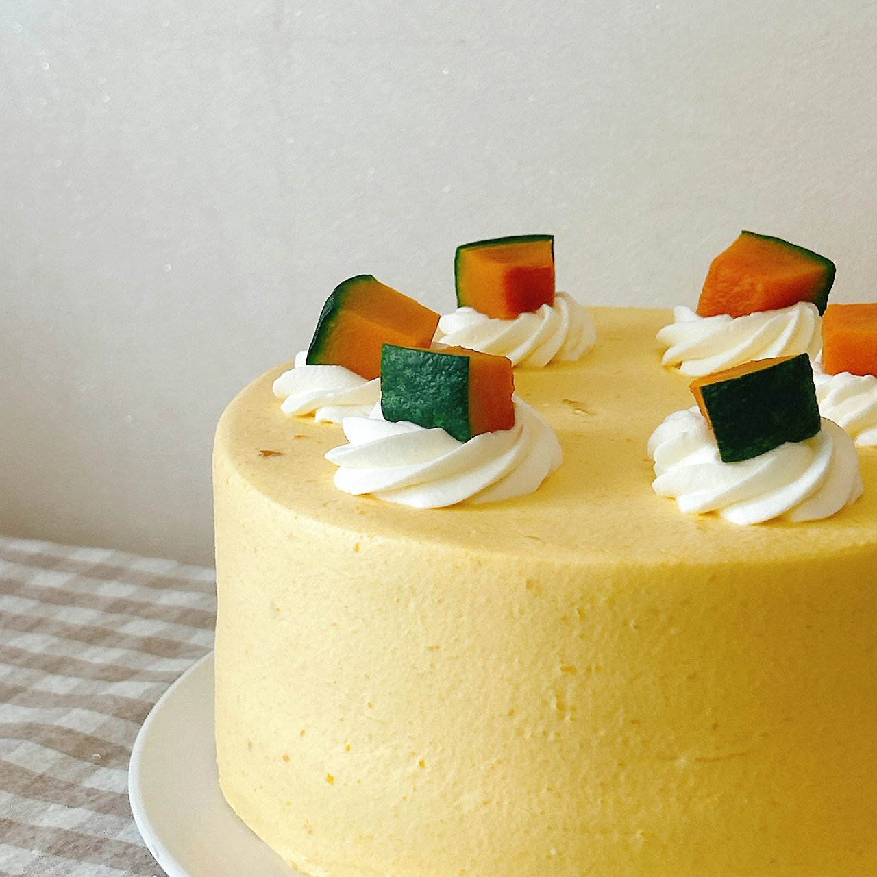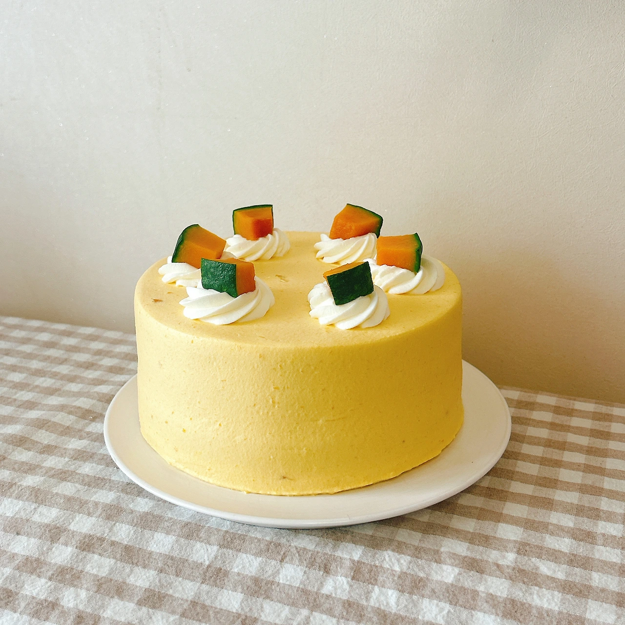 생크림을 소량 휘핑해 별깍지로 장식하고, 장식용 단호박을 여섯 개 올리면 케이크 완성.