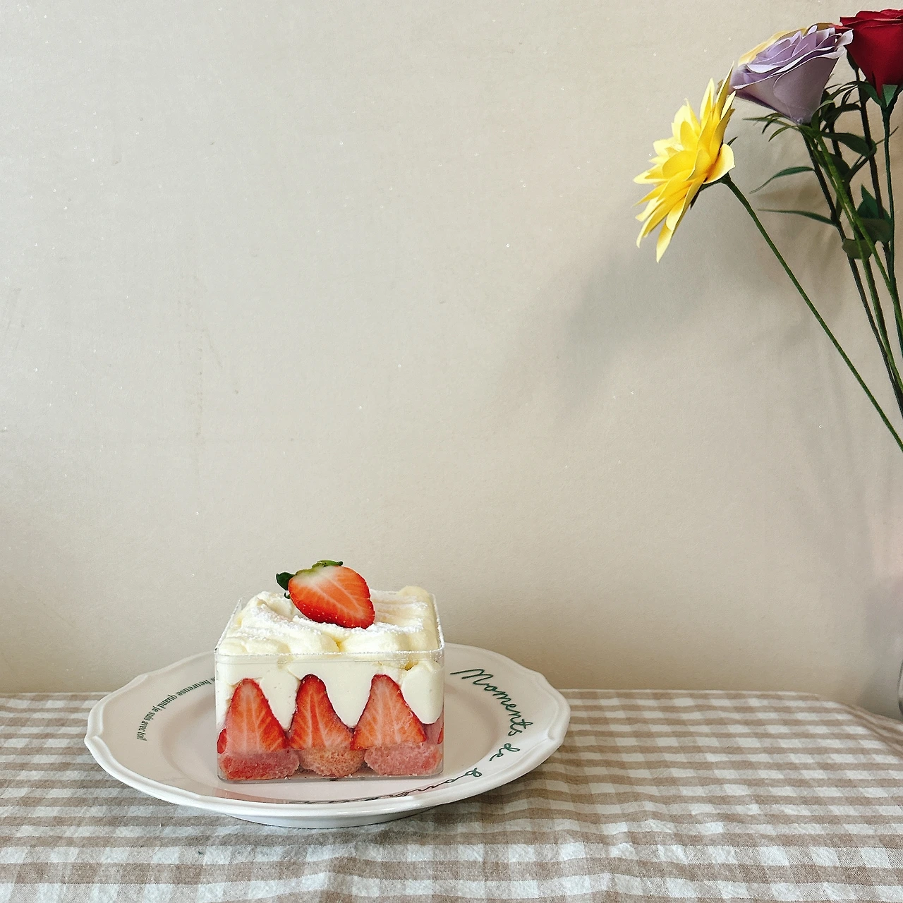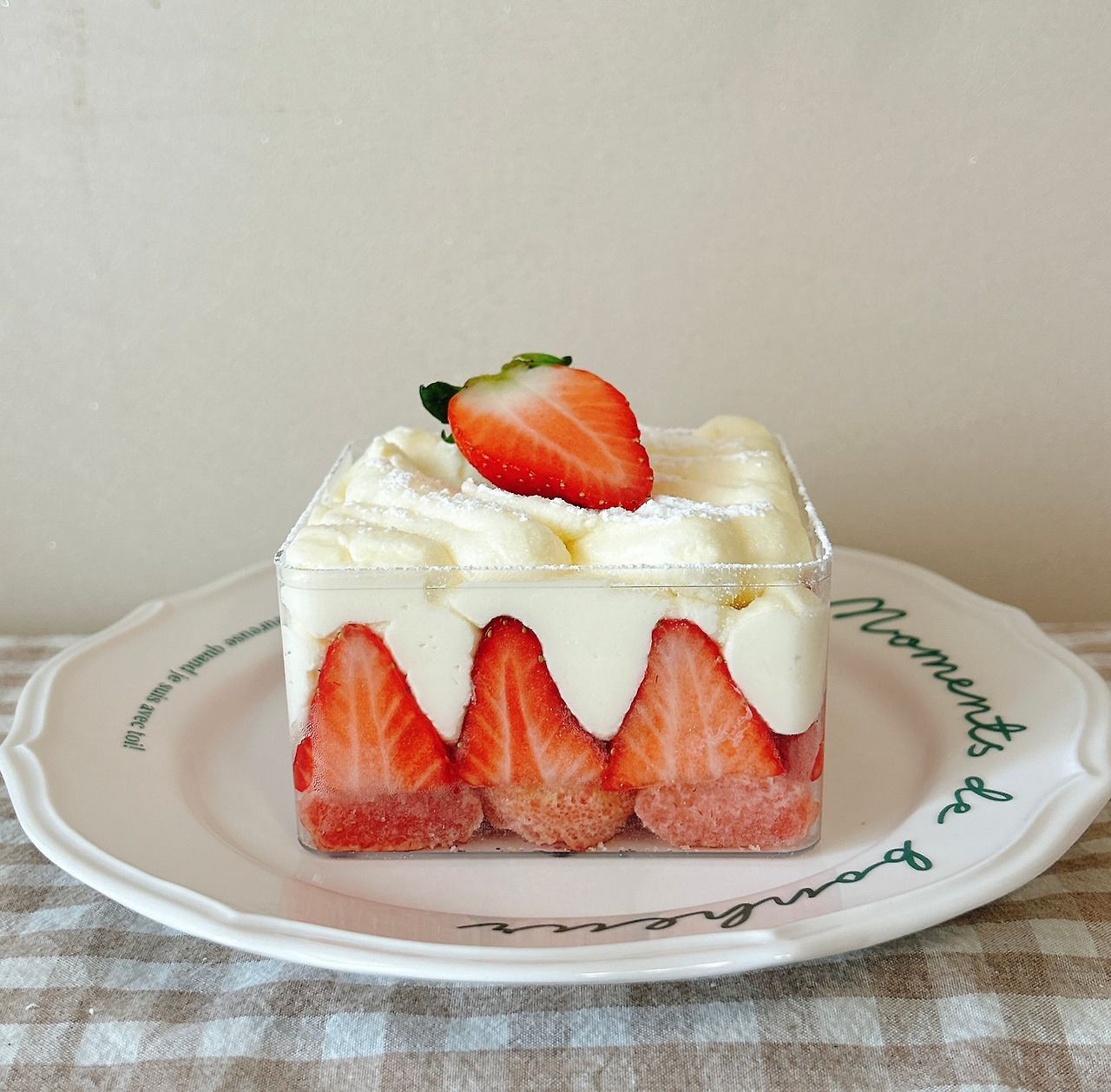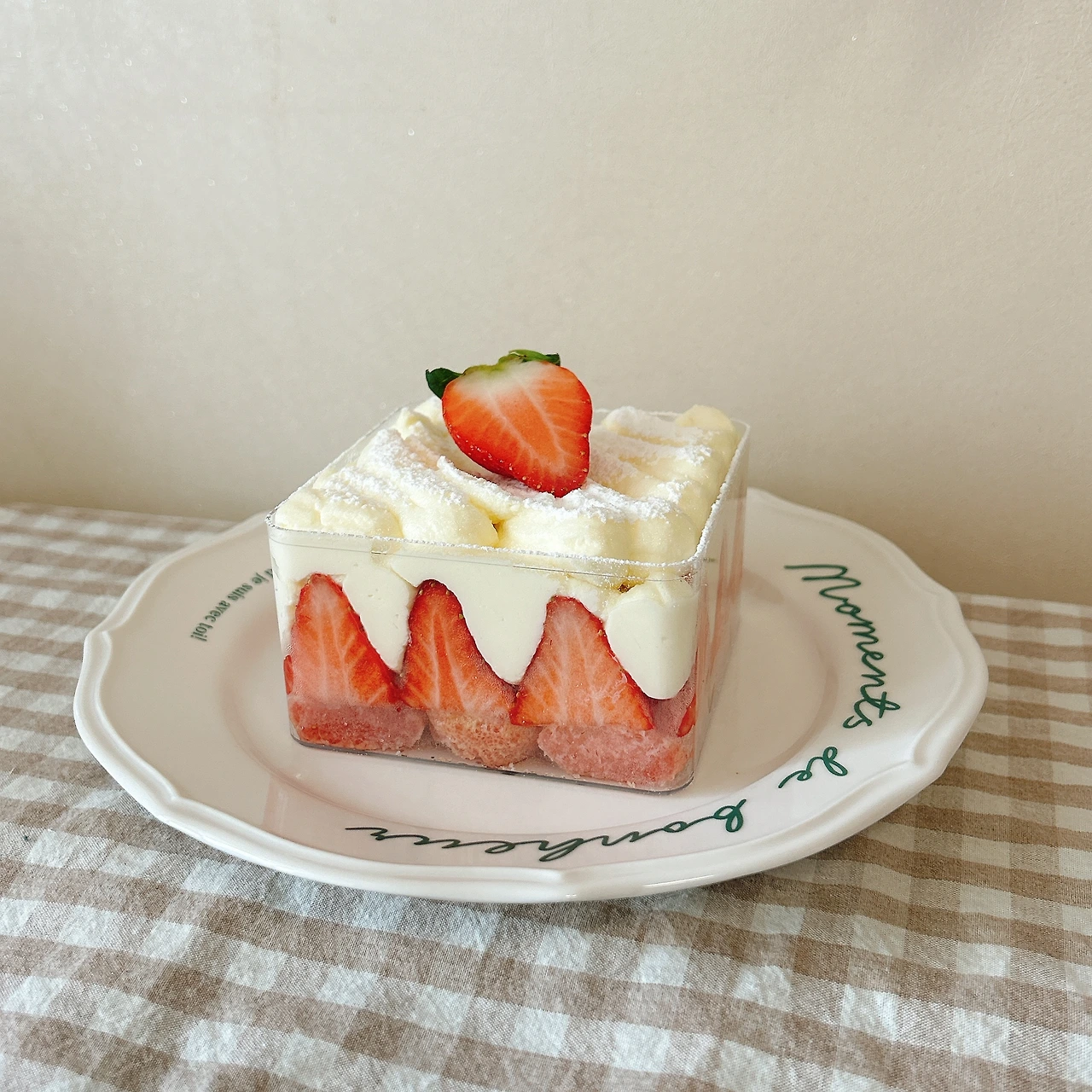 정사각 보틀에 시트 > 시럽 > 딸기 과육 > 크림 순으로 넣어 케이크를 완성한다.