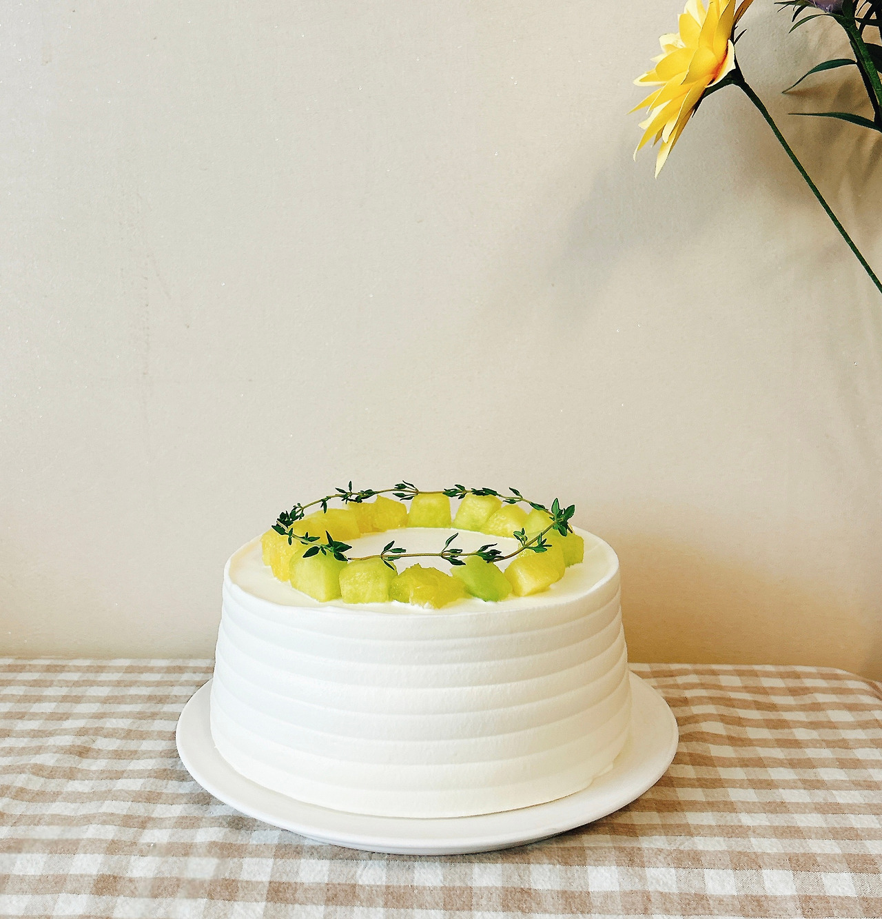 장식용으로 남겨 둔 멜론을 동그랗게 얹고, 깨끗이 씻은 타임을 빙 둘러 얹으면 케이크 완성.