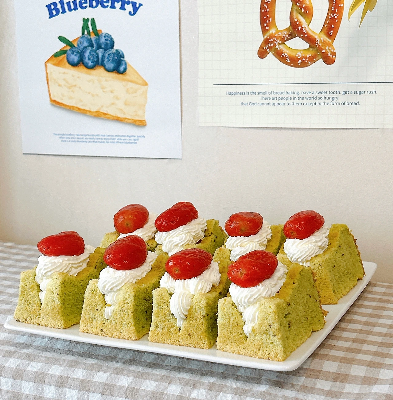 구운 쉬폰 시트는 틀째로 식히고, 조심조심 팬에서 분리한다. 여덟 등분으로 자른 뒤, 가운데에 칼집을 깊게 내어 둔다.