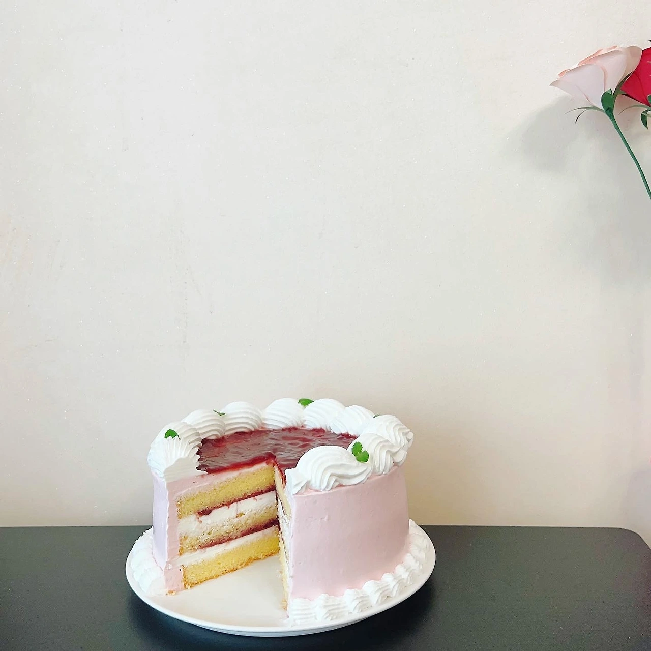 여러 색깔이 들어가서 이 케이크는 단면이 정말 예쁘다. 노란 제누와즈, 하얀 인서트 크림, 새빨간 라즈베리 잼, 분홍색 라즈베리 크림까지.