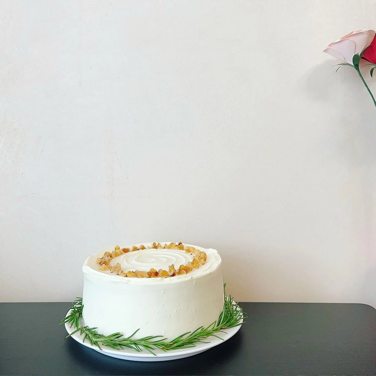로즈마리 장식은 예쁘긴 하지만 추천하지는 않는다. 로즈마리 향이 강해서 케이크의 풍미를 저해할 수 있기 때문이다. 다음엔 로즈마리 없이 새로운 장식을 생각해 봐도 좋겠다.