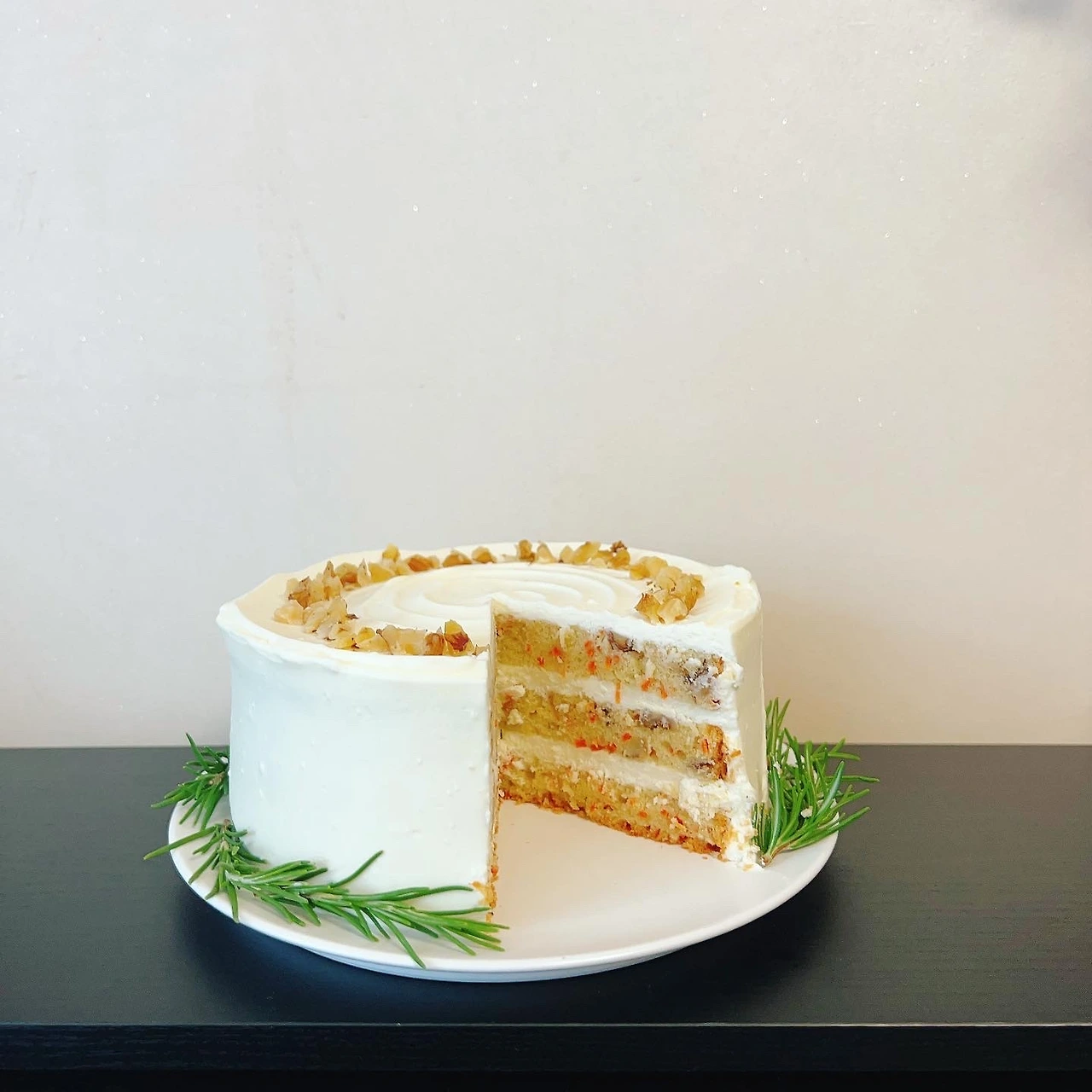 당근과 오일을 넣어 촉촉한 시트. 호두의 고소한 맛과 향긋한 시나몬 향이 잘 어우러지는 당근 케이크.
