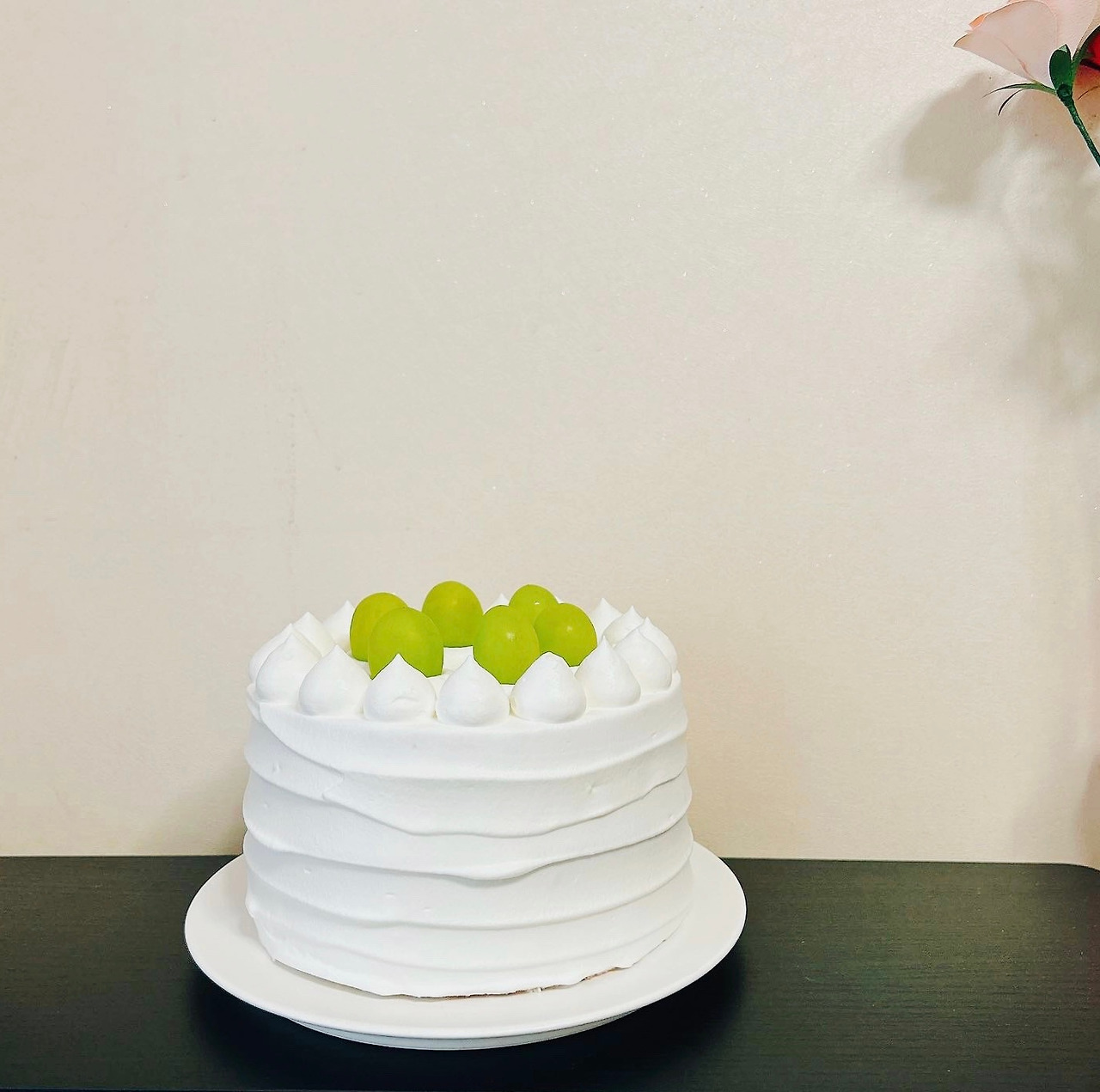 윗면 가장자리에 원형 깍지로 생크림을 짜 장식한다. 예쁘고 싱싱한 청포도 여섯 개를 윗면에 얹으면 완성.