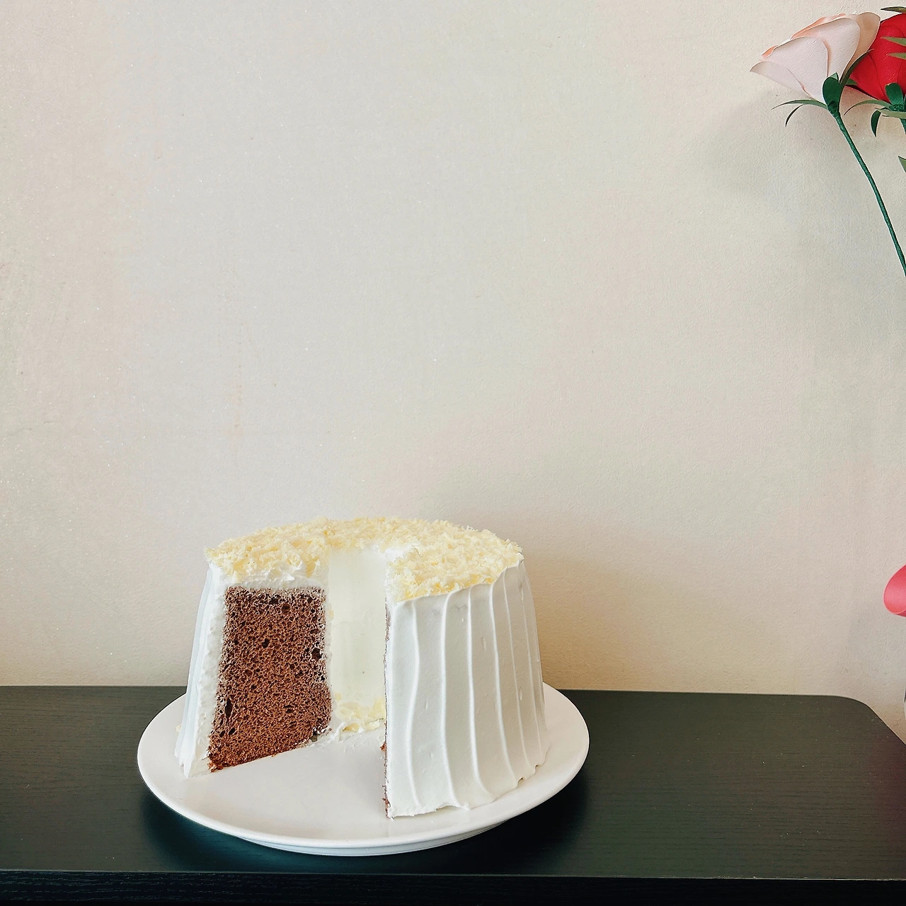 달콤한 코코아 쉬폰 시트와 부드러운 화이트 초콜릿 크림. 케이크 윗면에 얹은 화이트 블로썸이 케이크를 더 감각 있게 만든다.