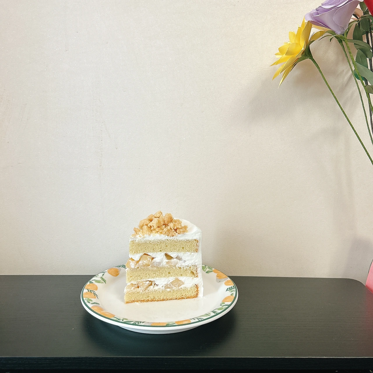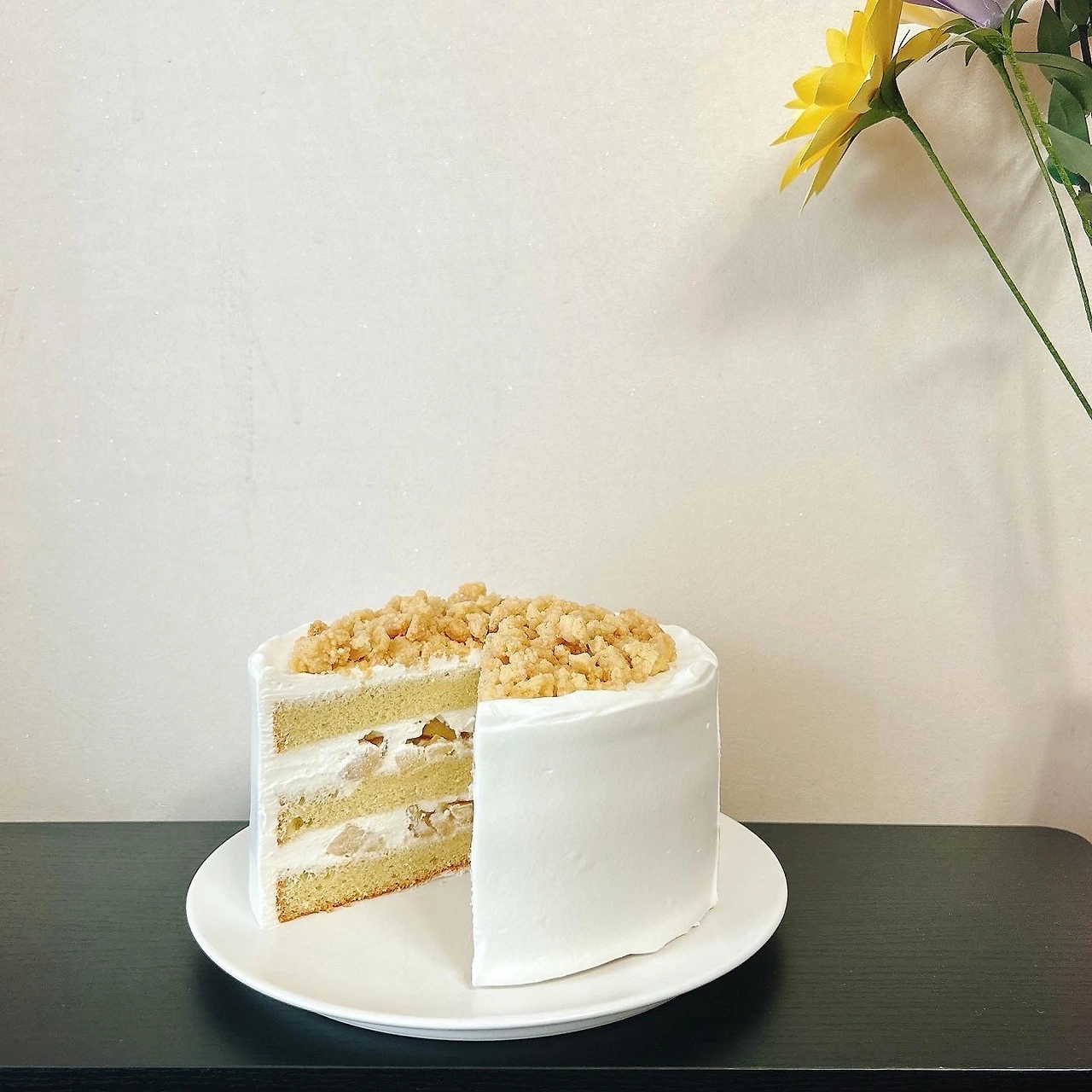 보송한 시나몬 제누아즈에 고소하고 부드러운 크림. 시나몬 향이 물씬 풍기는 사과 조림과 달콤하고 바삭한 크럼블. 이 모든 것들이 완벽하게 조화를 이룬다.