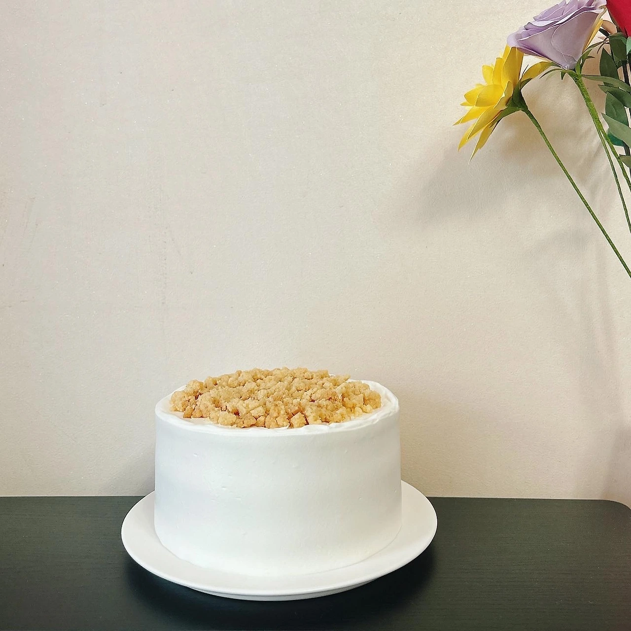 케이크 가장자리에 자연스럽게 크림이 올라오도록 아이싱한 뒤, 바삭하게 구운 크럼블을 듬뿍 올리면 완성.