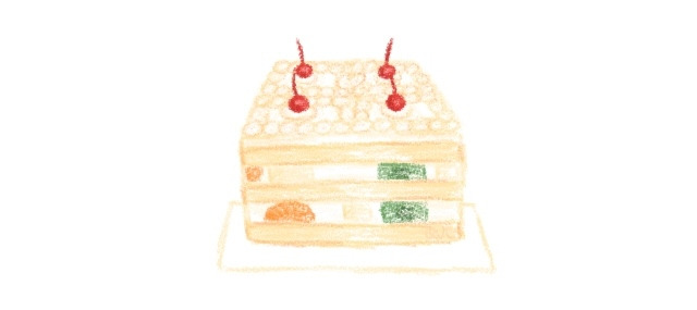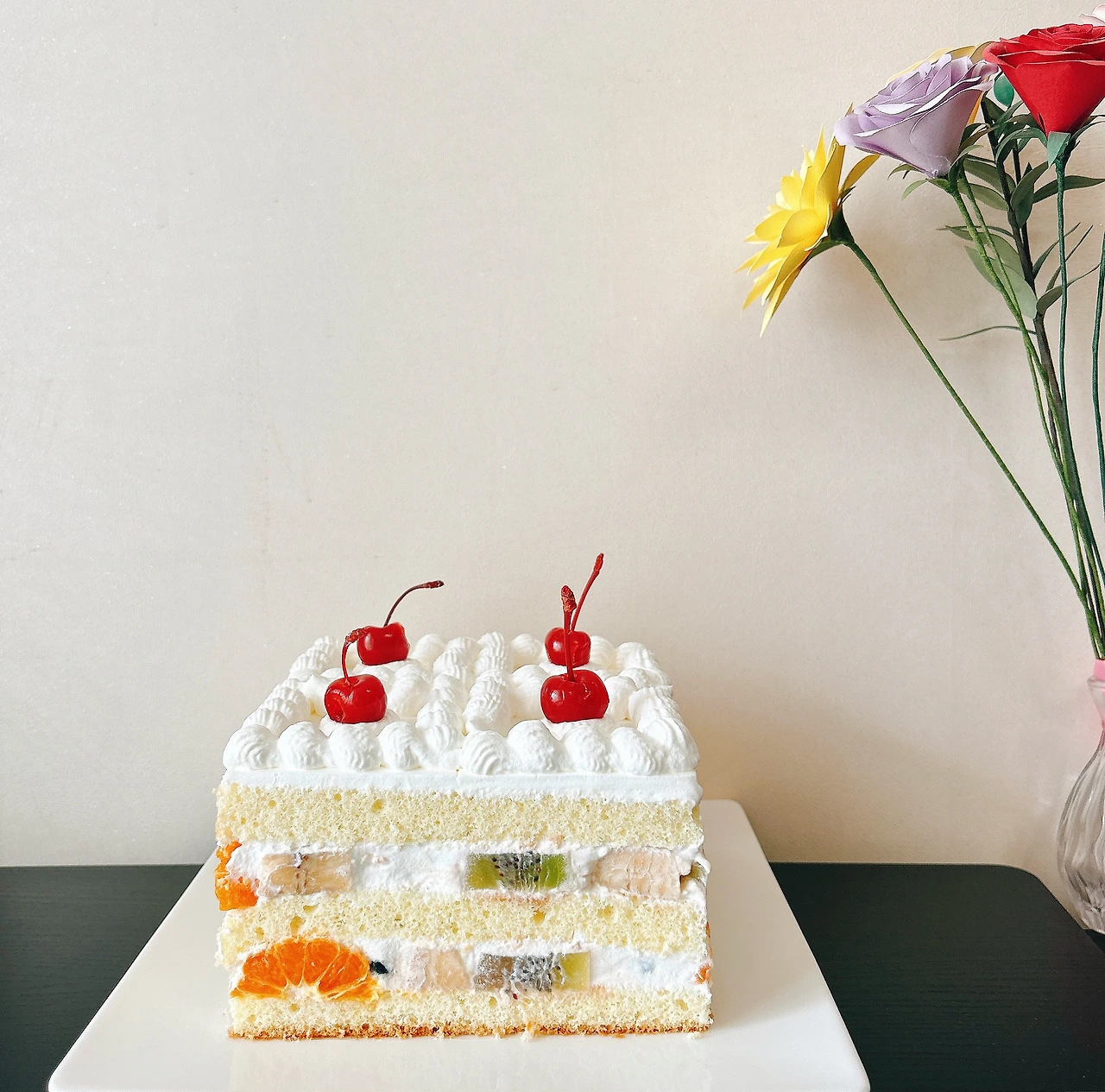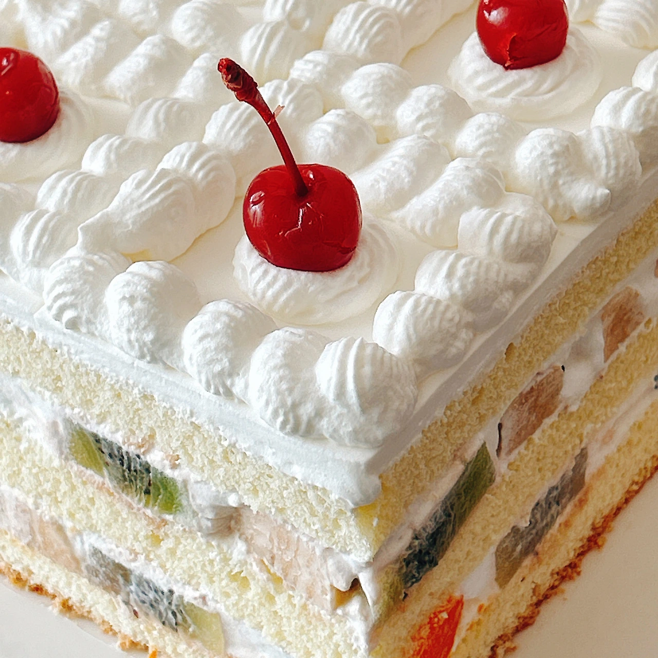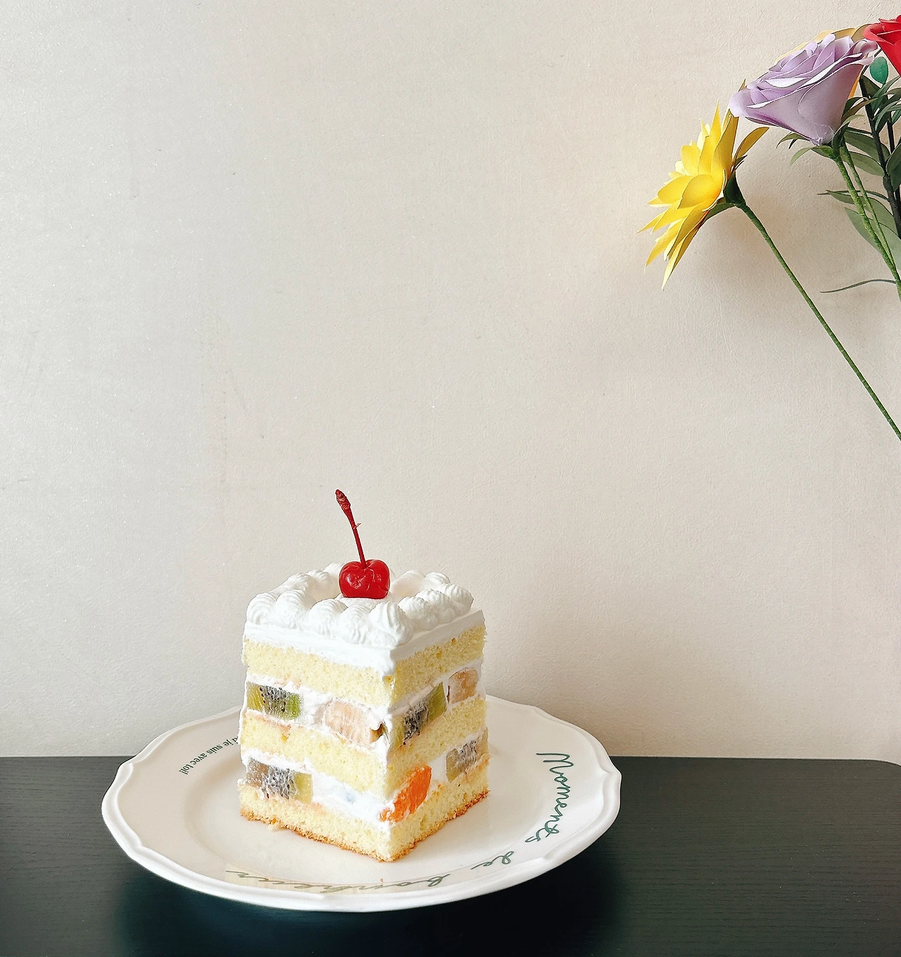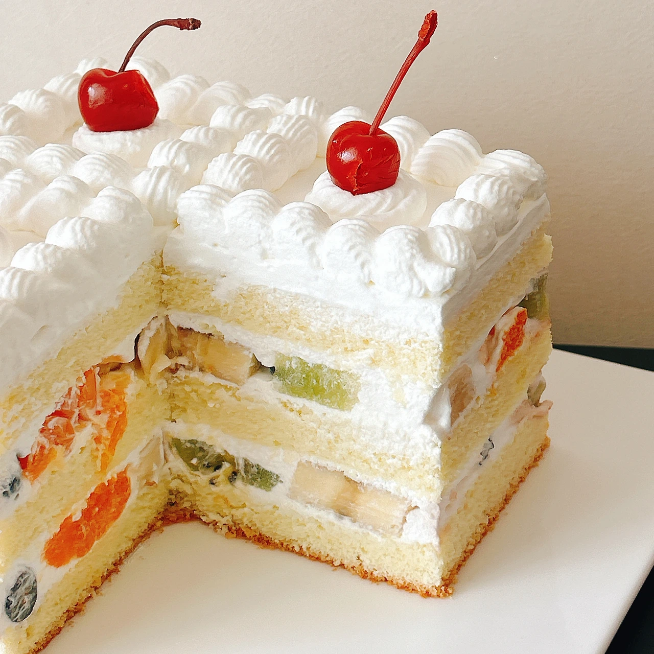 촉촉하고 보송보송한 바닐라 맛 제누와즈에 달콤한 연유 크림을 샌드하고, 다양한 과일을 풍성하게 넣은 과일 케이크. 포크로 조각 내어 입에 넣으면, 연유의 밀도 높은 단맛, 제누와즈의 부드러움, 과일들의 새콤달콤함이 사르르 녹아내린다.