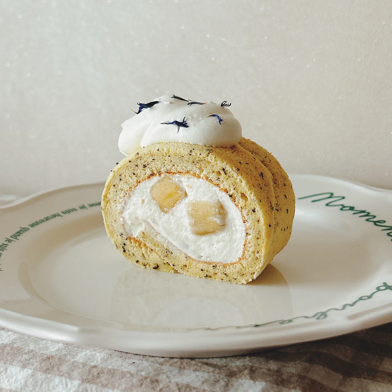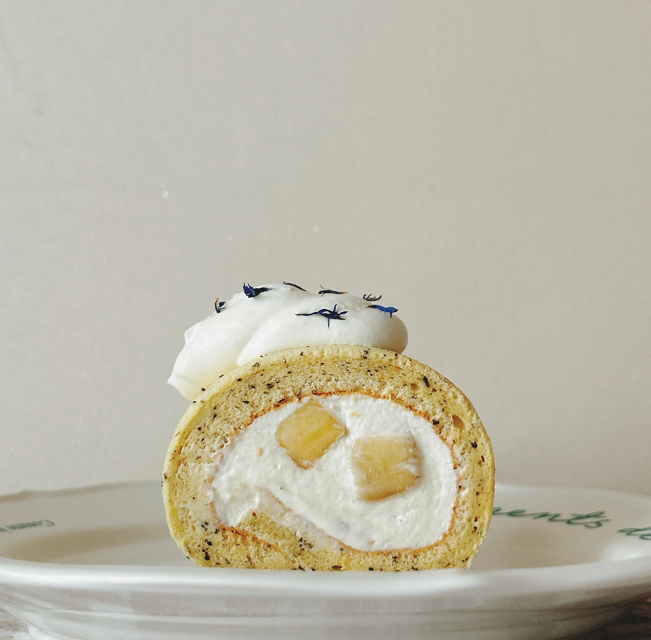 쉬폰법으로 롤케이크 시트를 만든다. 자연스러운 무늬를 위해 밀가루에 얼그레이 티백을 뜯어 섞는다. 머랭은 저속-중속으로 휘핑하다가 저속으로 마무리한다.