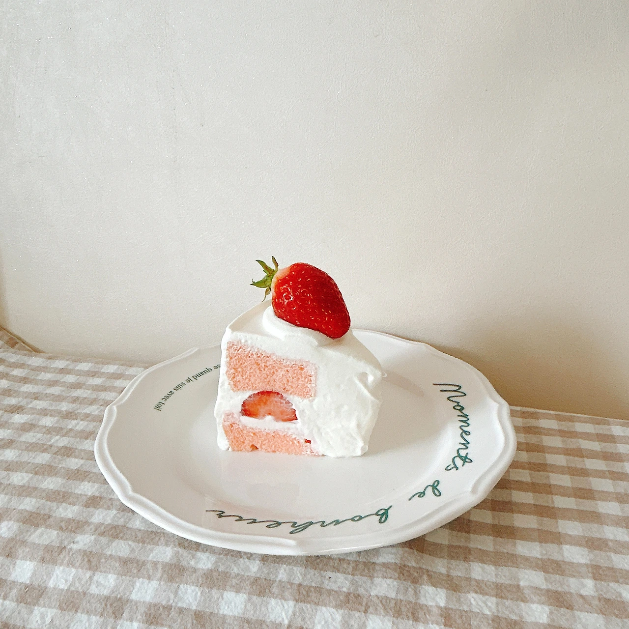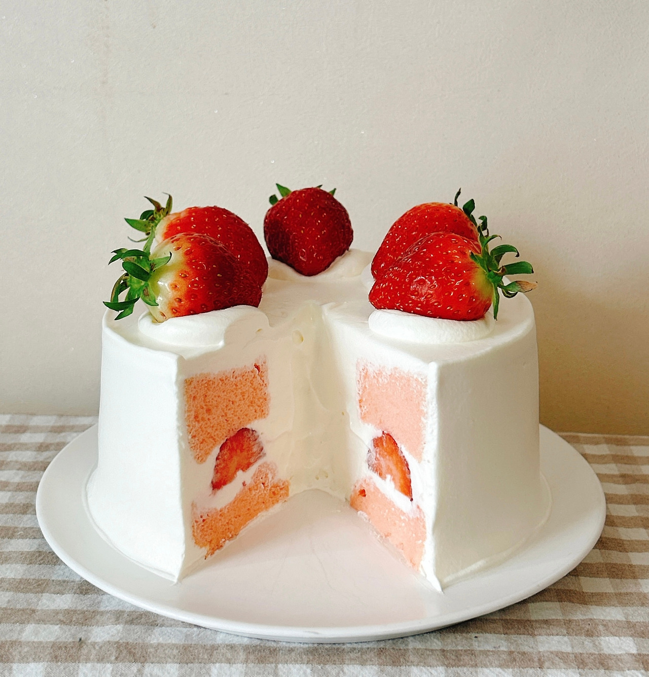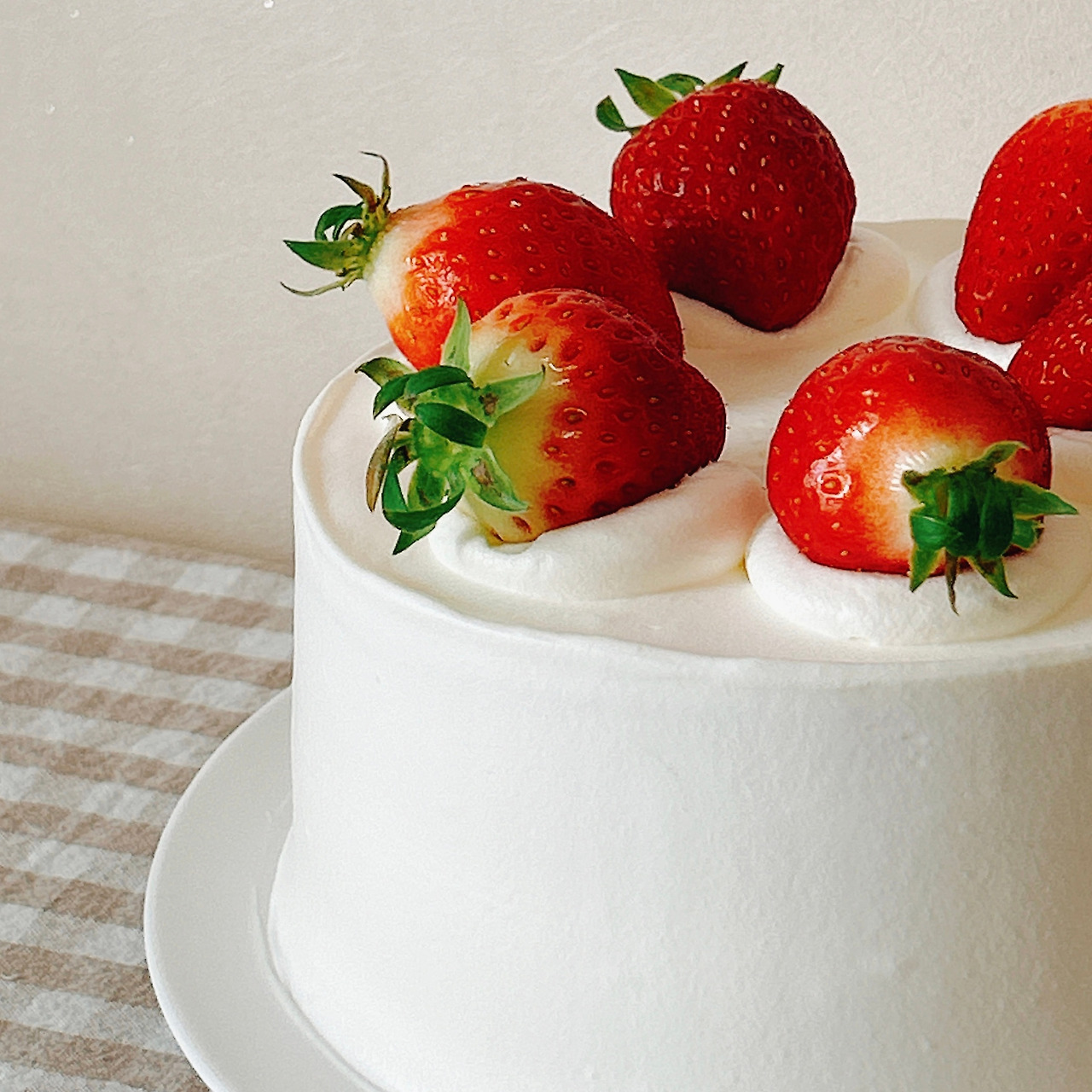윗면은 심플하게 장식해 보았다. 여섯 조각으로 자를 때 편하도록 크림도 딸기도 여섯 개. 조각으로 잘랐을 때, 크림 위에 느긋하게 누운 통통한 딸기와 시트 사이에 샌드한 반달 모양 딸기가 모두 정말정말 귀엽다.