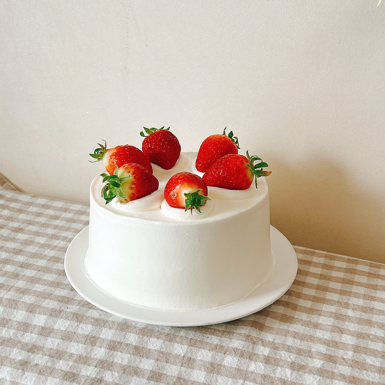 남은 크림을 원형 깍지로 장식하고, 예쁜 딸기를 여섯 개 골라 얹으면 케이크 완성.