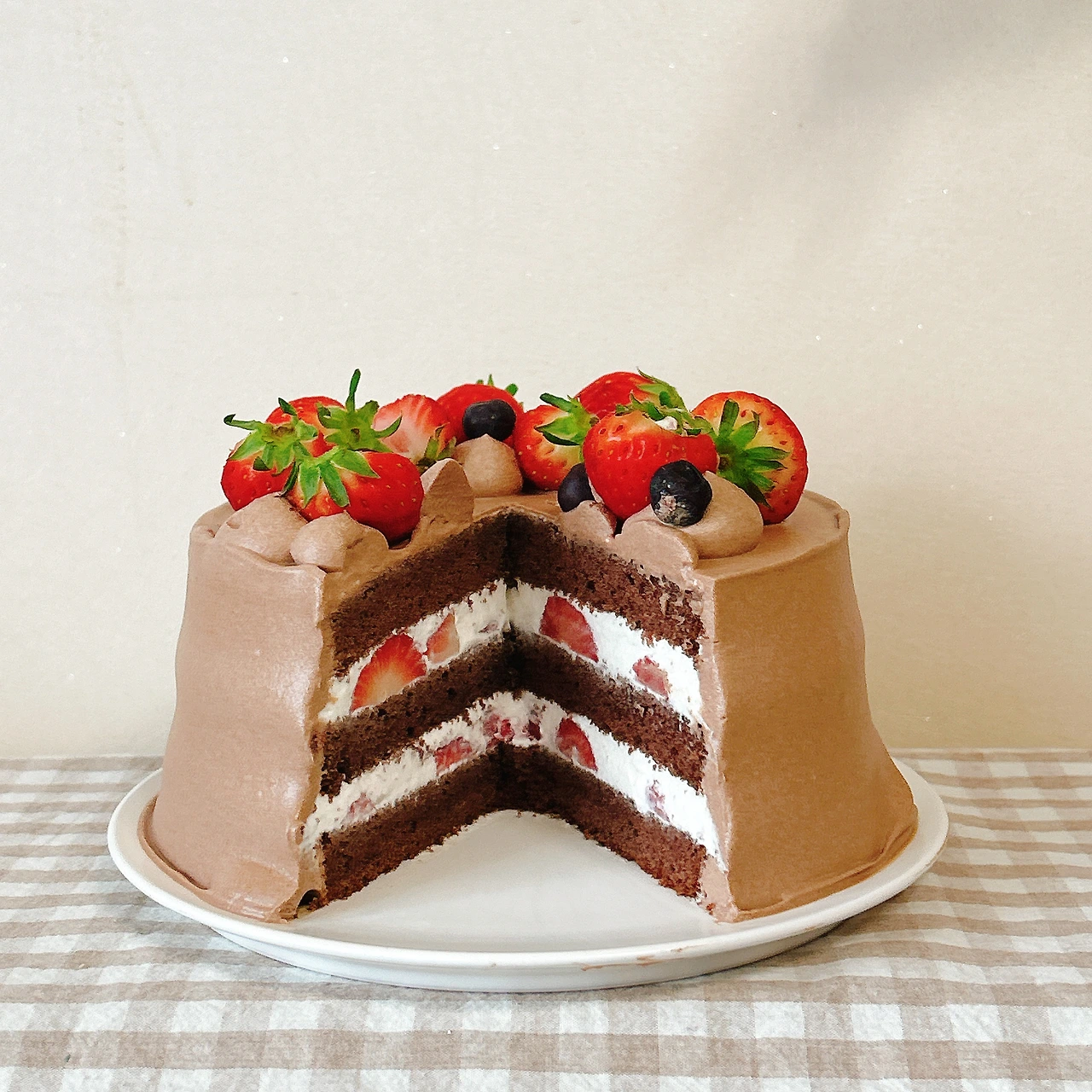 보송보송한 코코아 맛 시트에 쫀쫀한 연유 크림과 새콤달콤한 딸기를 샌드하고, 진한 다크 초콜릿 크림으로 마무리한 초코 딸기 케이크.