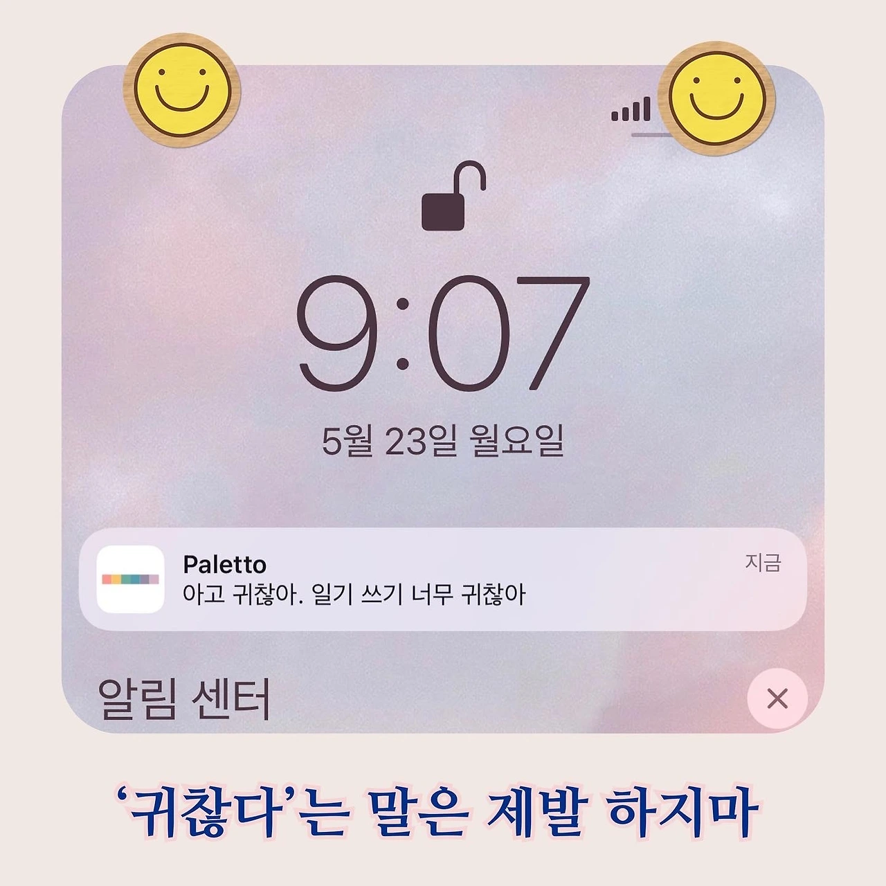 슬쩍 미소 짓게 만드는 알림이 또 와서 보니까 “아고 귀찮아”라고 적혀있길래. 나도 모르게 마음속으로 ‘귀찮아도 해!’라고 어플에게 말하게 되었다. ㅎㅎㅎ 스스로 경계하는 마음을 가지려고 하다가, 아 이거 적어놔야겠다 싶었다.