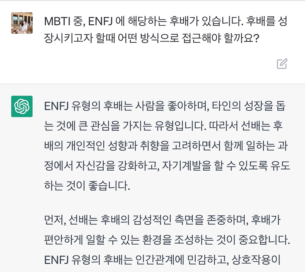 ENFJ 유형의 후배는 사람과의 교류를 중요시하므로, 선배는 후배와 함께 일하면서, 적극적인 팀워크와 협력을 장려하면서 함께 성장할 수 있는 기회를 만들어주는 것이 좋습니다. 마지막으로, 선배는 후배가 가진 역량과 잠재력을 인정하고, 이를 발휘할 수 있는 기회를 제공하면서 함께 성장하는 과정에서 선한 모범이 되는 것이 중요합니다.
