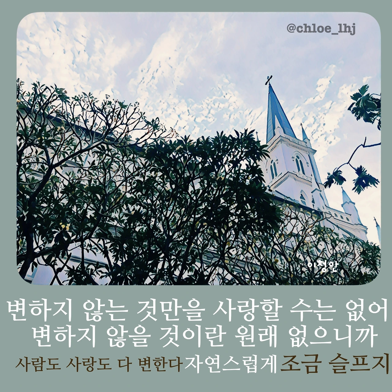 보통의 우리들은 변하지 않을 것을 사랑한다. 어쩌면 변하지 않을 내 마음을 믿고 내 감정의 동요를 사랑하는 건지도 모르겠다. 하지만 변하지 않는 것만을 사랑할 수는 없다. 변하지 않을 것이란 원래 없으니까. 사람도 사랑도 다 변한다. 그게 자연스러운 세상의 이치인 거지. 그래서 조금은 슬프다. 이제 변하지 않을 사랑만을 사랑한, 내 과거에 미안한 안녕을 고한다.
