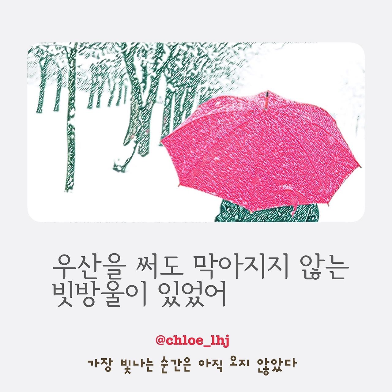 결론이 나지 않는 내 생각의 꼬리들처럼, 그칠 듯 말 듯 한 비는 그치지 않았다. 우산을 썼지만, 막아지지 않는 빗방울이 있었다. 소리 없이 와서는 내 발끝이며 어깨를 흠뿍 적셔버렸다. 어쩌면 그 사람을 향한 내 마음도 그랬다. 막아지지 않는 것이었다. 저절로 적셔지는 마음이었다.