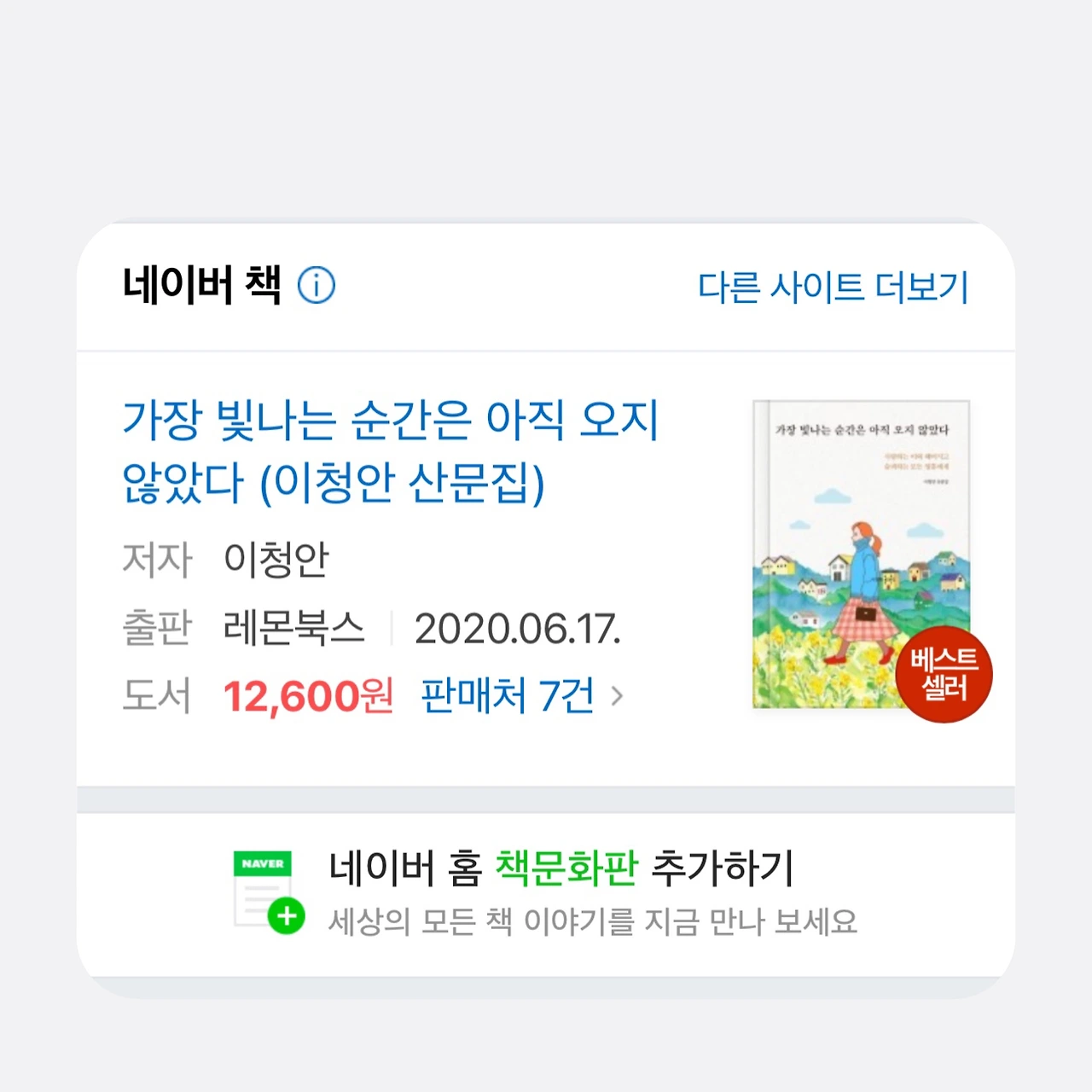 오늘(6월 23일) 내 책이 베스트셀러에 올랐다. 출간 당일(6월 17일 기준) 교보문고 시에세이 부문 103위였던 순위는 그 다음날 36위, 또 30위, 그다음 날은 28위, 좀 더 올라서 24위, 급기야 오늘은 18위까지 올라갔다. 그리고 역사적인 오늘. 잊지 못할 6월 23일. 내 책이 네이버 녹색 검색창의 '베스트셀러' 빨간딱지를 받게 되었다.
