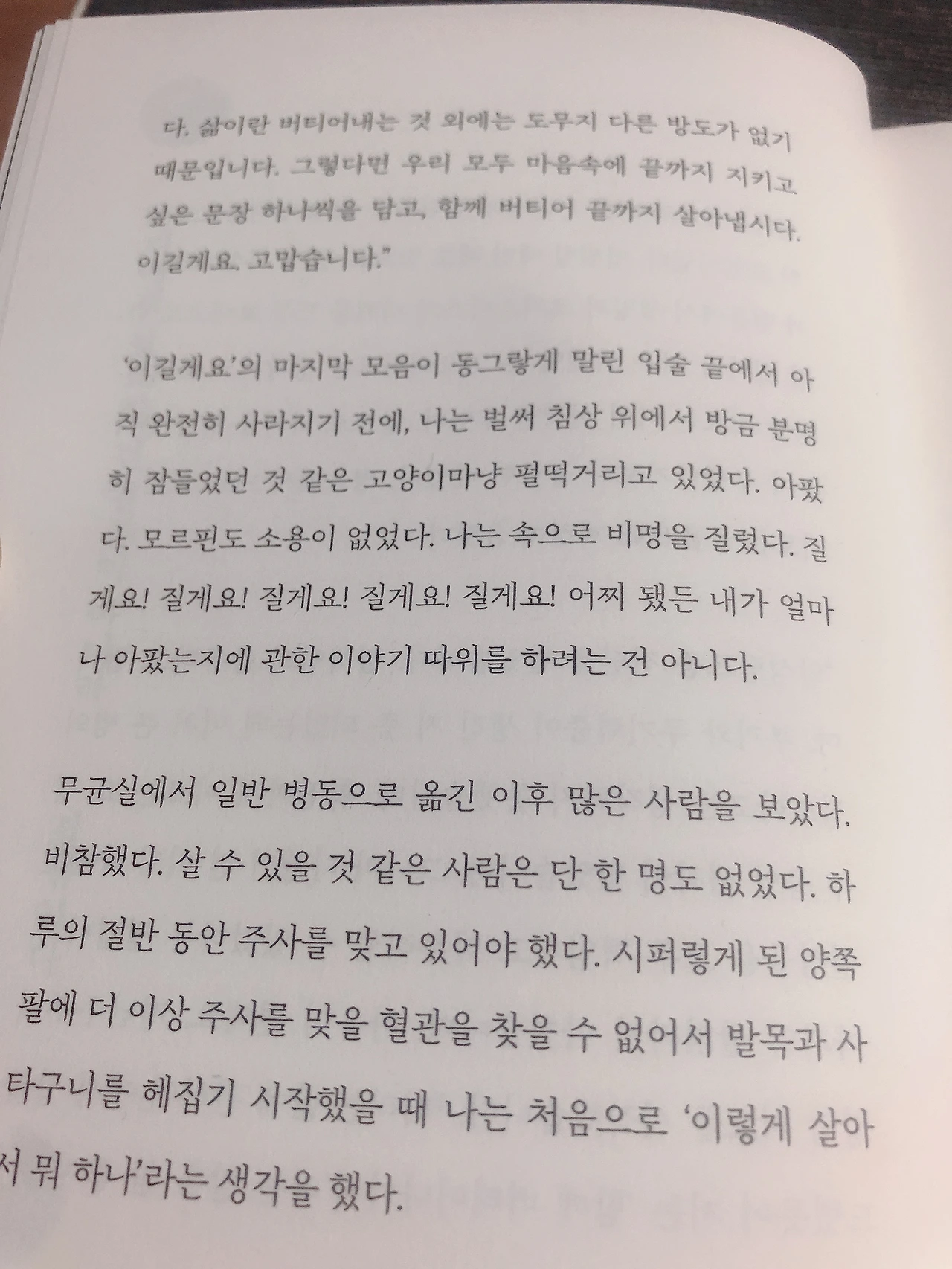 '허지웅'이라는 사람. 내게는 자신의 의견을 거침없이 피력하는 모습으로만 기억되었던 사람. 그러나 최근 ‘나혼자산다’ 같은 예능에서 보여준 모습은 존경스러웠다. 그는 전작의 제목과 같이 버티었고(항암), 우리들의 곁에 살아있다. 그것만으로도 나는 그가 자랑스럽고 존경스러웠다. 그가 얼마나 힘겹게 고통의 시간을 버텨왔고 이겨냈는지, 우리는 알 재간이 없다. 그러나 이 책 ‘살고 싶다는 농담’을 읽고 나니 아주 조금은 짐작된다. 책을 읽기 시작하자마자 깔끔한 문장과 담백한 문체 뒤편 어딘가에 그가 숨겨 놓은 고통의 밤과 이불속에 함께 기거했을 상처가 내 공간 곳곳을 뒤덮어버렸다. 슬펐다. 그것도 아주아주 슬펐다. 그래서 단숨에 다 읽게 되었는지도 모르겠다.