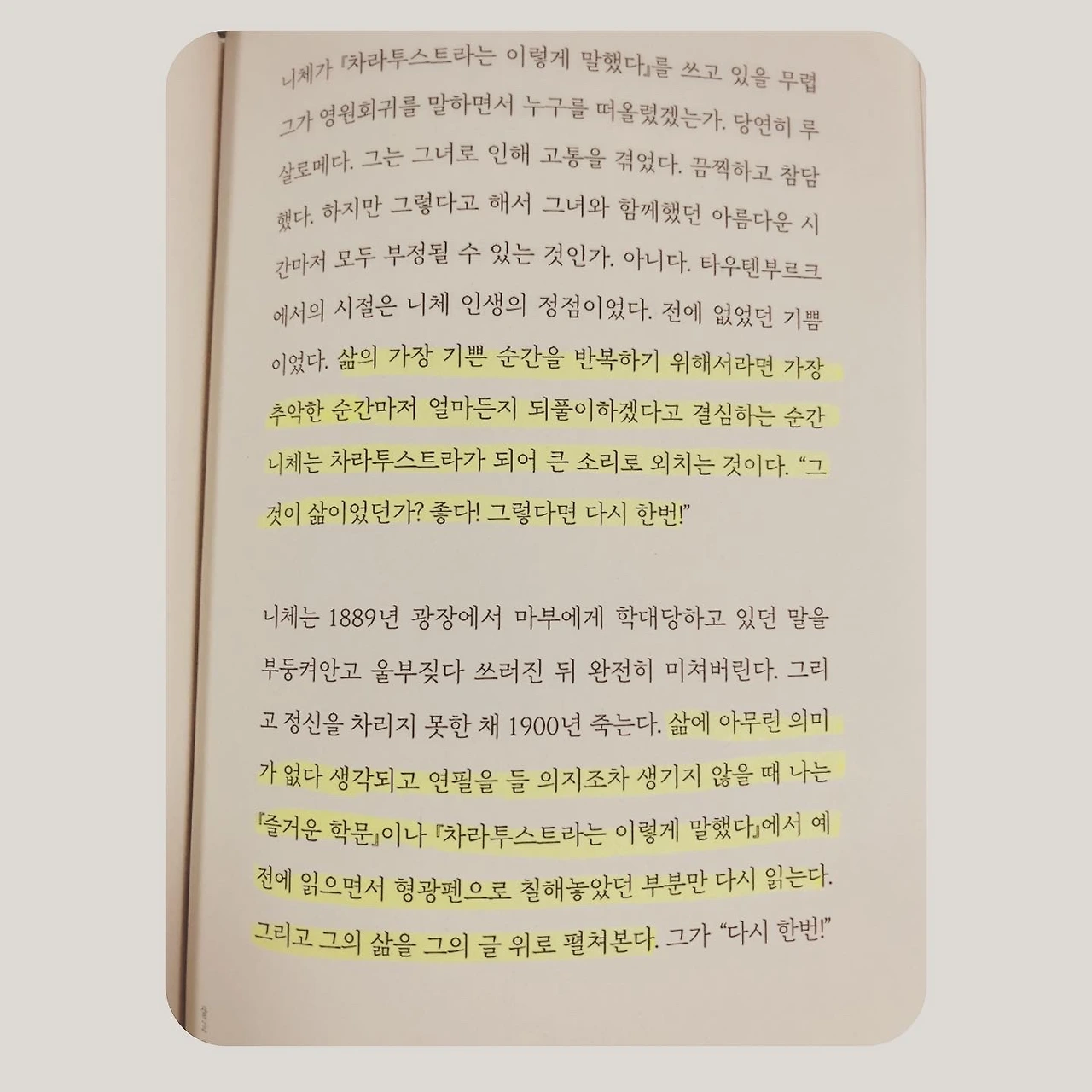 책의 모든 부분이 좋았다. 그 예감은 초반부터 강하게 다가왔다. 나는 책에 밑줄을 치거나 형광펜을 두르는걸 별로 좋아하지 않는다. 책을 깨끗하게 보는 편이다. 책은 보통, 내 영혼을 정화시키는 존재이다. 그러니까 그 자체로 깨끗했으면 하는 바람이 있다. 그래서 더럽히지 않고자 줄 긋기를 삼간다. 그래도 더러 밑줄을 치거나 형광펜을 사용하는 책이 있다. 책을 십 퍼센트 정도 읽었을 때 ‘안 되겠다’ 싶으면 그 책은 밑줄을 친다. 나는 책의 모든 내용을 소유하고 싶을 때, 그리고 언제 꺼내도 내게 영향을 준 그 부분을 바로 보고 싶을 때, 그런 확신이 든 때에만 책에 흔적을 남긴다. 그러니까 머리와 가슴에 동시에 남는 문장이 많을 때에만 밑줄을 친다. 다 읽고 나니 판단이 틀리지 않았다는 생각이 든다. 한 장 걸러 한 부분씩 형광펜의 흔적이 보인다. 그렇게 형광물을 들이고도 뒷장으로 넘기기가 어려워(아쉬워서) 자꾸 돌아보게 만드는 문장들이 차곡차곡 또 빽빽하다. 그가 페이지 173에서 니체의 책을 ‘형광펜으로 칠해 놓았던 부분만 다시 읽는다’고 한 것처럼 언젠가 나도 “다시 한번!”을 외치며 이 책을 읽을 것이다.