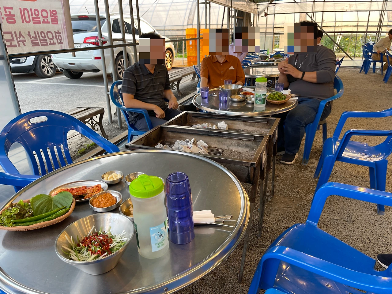 일단 자리에는 이렇게 숯불과 기본 상차림을 준비해주세요. 불은 캠핑장 좋은곳에 같을떄 바베큐 느낌 아시죠 딱 그런 느낌입니다.