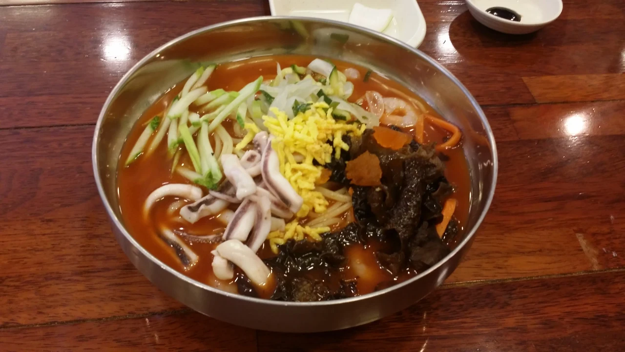 하지만 오이를 체 썰어 넣은 거나 오징어를 데쳐서 썰어 넣은 건 신의 한 수입니다. 매운 냉면에 면을 질긴 짜장면을 넣었다고 상상하시면 됩니다. 고명이 소고기 대신 오징어와 새우가 들어간다는 것