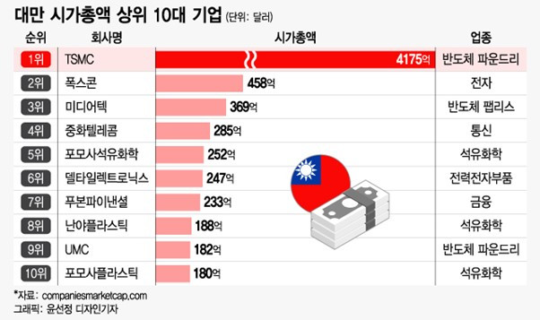 위 그래프는 대만의 시가총액 상위 10위권 기업을 정리한 것인데요. TSMC가 압도적인 1위입니다. 2위 폭스콘과 비교해도 약 10배의 차이를 보이죠. 그야말로 TSMC가 대만 경제에 차지하는 영향력은 어마어마하다고 볼 수 있습니다.