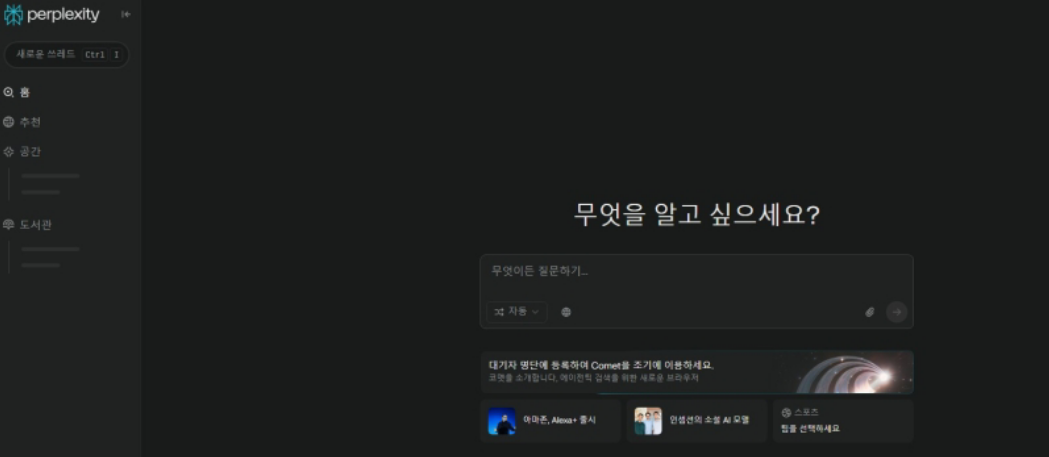 반면 AI 검색 엔진의 대장이라고 불리는 퍼플렉시티의 메인을 보겠습니다.
