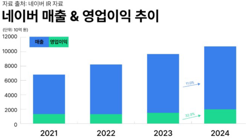 이번에 발표된 네이버의 2021년~2024년의 매출액과 영업이익을 나타낸 그래프를 살펴보면 다음과 같습니다.